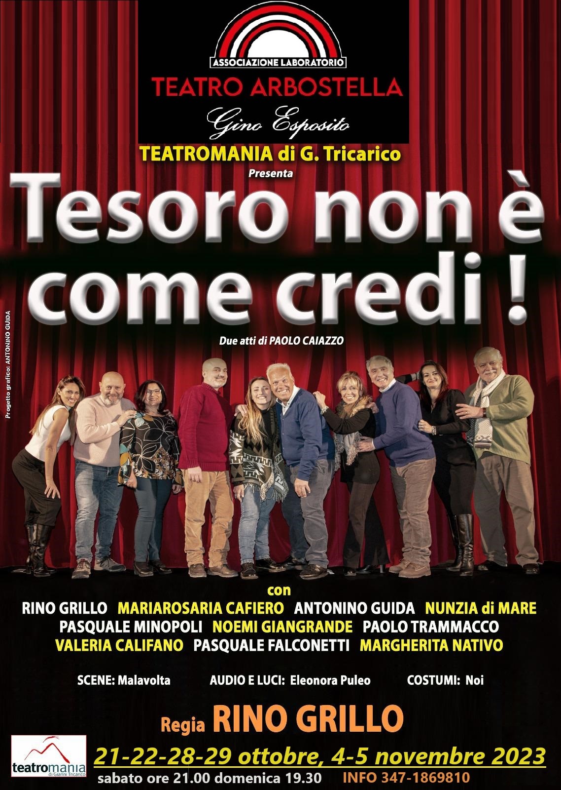 Prosegue, all’insegna della comicità, il cartellone della XVI stagione del Teatro Arbostella Gino Esposito. Dopo l’apertura ricca di consensi e applausi riscontrata da Sasà Palumbo e la sua Compagnia con Caino si è fatto prete, ecco un altro testo esilarante ad allietare il folto pubblico della struttura di Viale Verdi. Nei prossimi tre week-end in scena “Tesoro, non è come credi!”, farsa scritta oltre una decina di anni fa da Paolo Caiazzo, è interpretata dalla compagnia Teatromania di Gianni Tricarico di Napoli, diretta da Rino Grillo e da anni presente nel cartellone ideato dal compianto Gino Esposito.