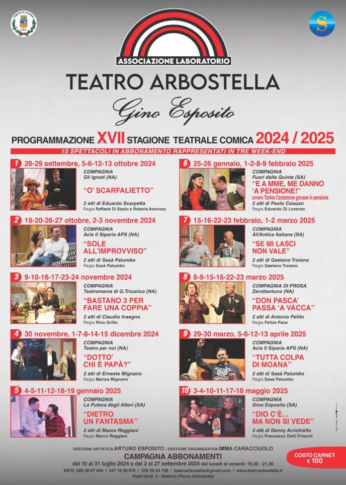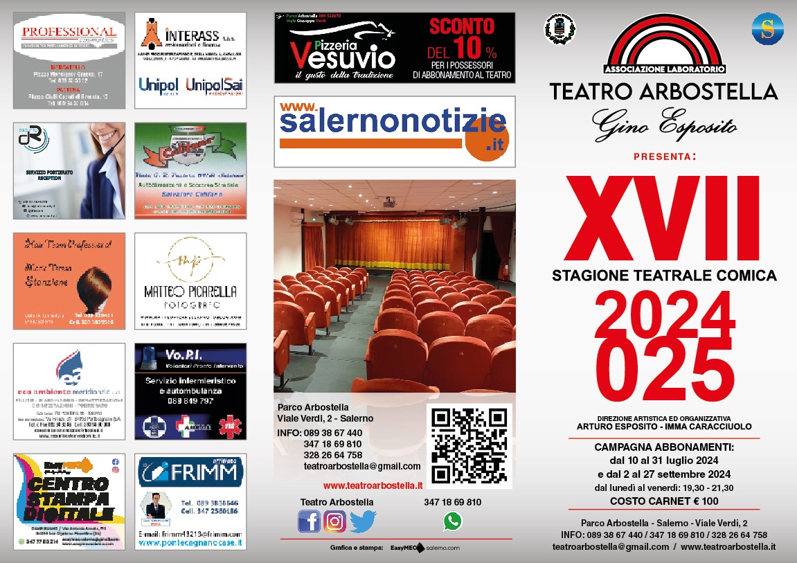 Al via anche la campagna abbonamenti. Chi vorrà potrà sottoscrivere la tessera a 10 spettacoli al costo di 100 euro da mercoledi 10 luglio sino al 31 luglio e dal 2 al 27 settembre 2024 (tutti i giorni da lunedì a venerdì ore 19.30-21.30). La direzione del teatro comunica inoltre che, essendoci stata una vasta adesione al rinnovo della tessera da parte dei vecchi abbonati, il numero dei carnet disponibili è già limitato per cui si consiglia di affrettarsi all’acquisto. Inoltre, quest’anno, da una sinergia e collaborazione con varie attività commerciali e sconti vantaggiosi per coloro che acquistano l’abbonamento oltre che l’adesione al bonus docente.