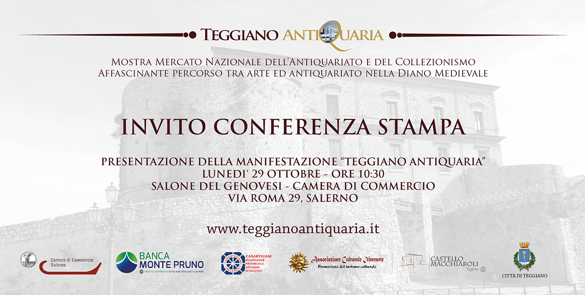 Teggiano Antiquaria è organizzata da Casartigiani Salerno, in collaborazione con l’Associazione Culturale Itinerarte. L’evento è cofinanziato dalla Camera di Commercio di Salerno, con il patrocinio del Comune di Teggiano ed in partnership con la Banca Monte Pruno. La cerimonia inaugurale di Teggiano Antiquaria è in programma mercoledì 31 ottobre alle ore 17:30, presso il Castello Macchiaroli di Teggiano.