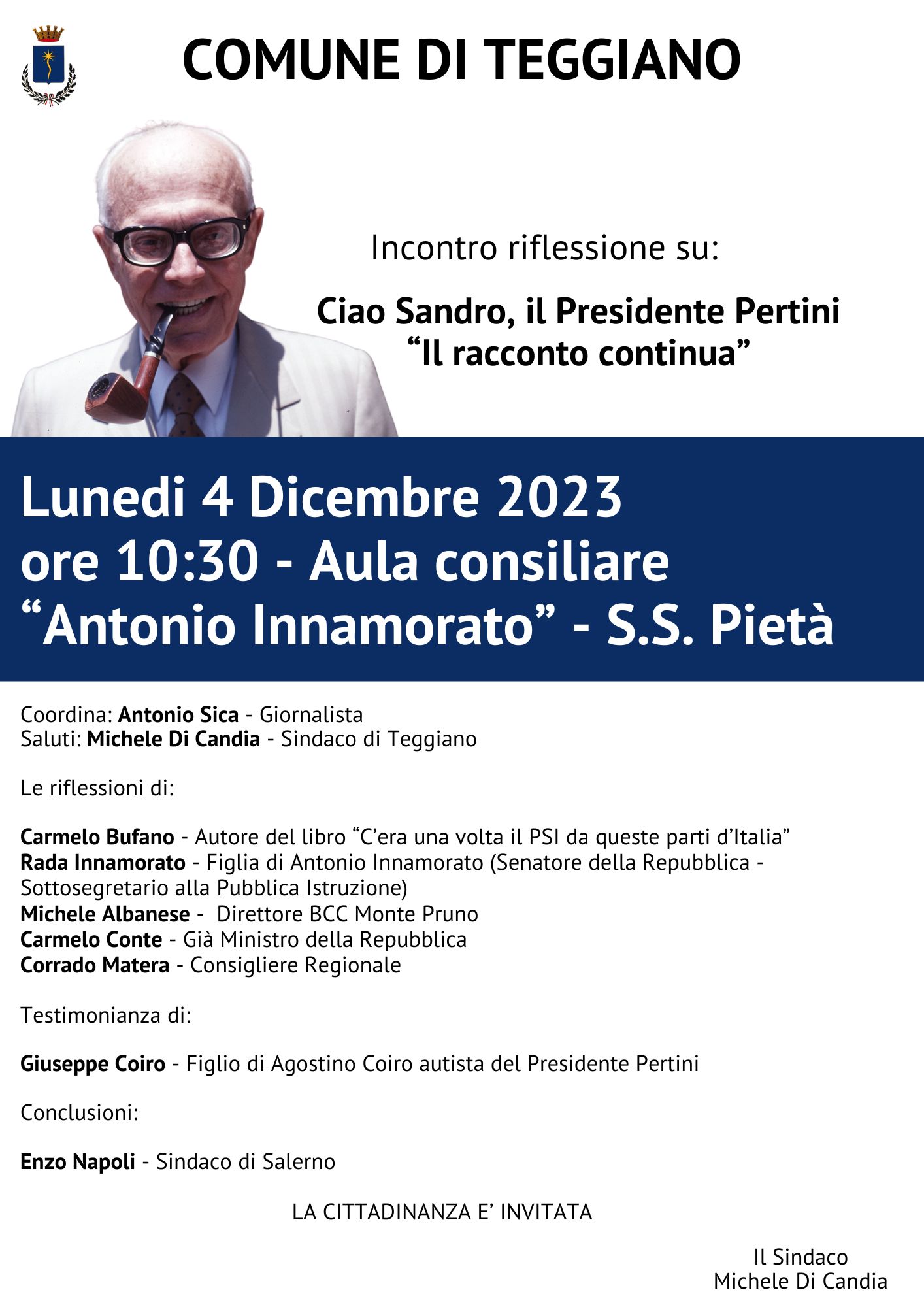 “Sono molto contento -sottolinea il sindaco Michele Di Candia– di ospitare a Teggiano un importante evento dedicato al ricordo del nostro Presidente più amato, la cui morte ha lasciato un vuoto nel cuore di tutti gli Italiani. Sono passati più di trent’anni dalla sua scomparsa, ma Sandro Pertini non è stato dimenticato, per la sua storia personale e anche per il modo in cui, una volta eletto Presidente, ha saputo incarnare quel ruolo così significativo. Non a caso «Il Presidente Pertini, il racconto continua» è lo slogan che abbiamo scelto per questo appuntamento, nel corso del quale avremo modo di approfondire non soltanto il momento storico che lo vide al Quirinale e le qualità istituzionali che seppe dimostrare, ma anche il suo lato umano, attraverso testimonianze e riflessioni di grande spessore e significato”.