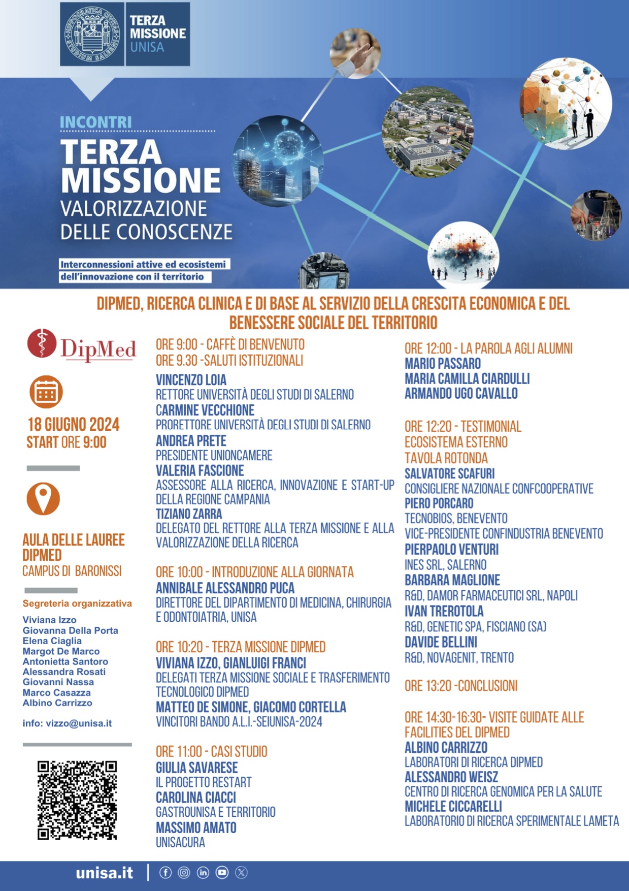 Una full immersion nella necessità- opportunità di implementazione di connessioni tra università e territorio che, proseguirà anche nel pomeriggio con visite guidate presso le facilities del dipartimento che includono i Laboratori di Ricerca Biomedica e Traslazionale, il centro di ricerca Genomica per la Salute CRGS ed il Laboratorio di Ricerca Sperimentale LAMeTA, visite guidate per le quali è necessaria la prenotazione che potrà essere effettuata attraverso il QRCode presente sulla locandina.