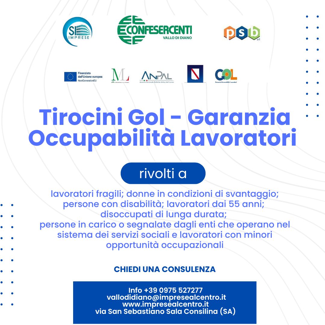 La Confesercenti Vallo di Diano, guidata dalla dottoressa Maria Antonietta Aquino, informa sull’opportunità tirocini offerta dal programma GOL (Garanzia Occupabilità Lavoratori): un’azione di riforma prevista dal PNRR che ha l’obiettivo di accompagnare le persone alla ricerca del lavoro e prevede strumenti e misure per favorire il loro inserimento o reinserimento lavorativo oppure per avviare percorsi di riqualificazione.