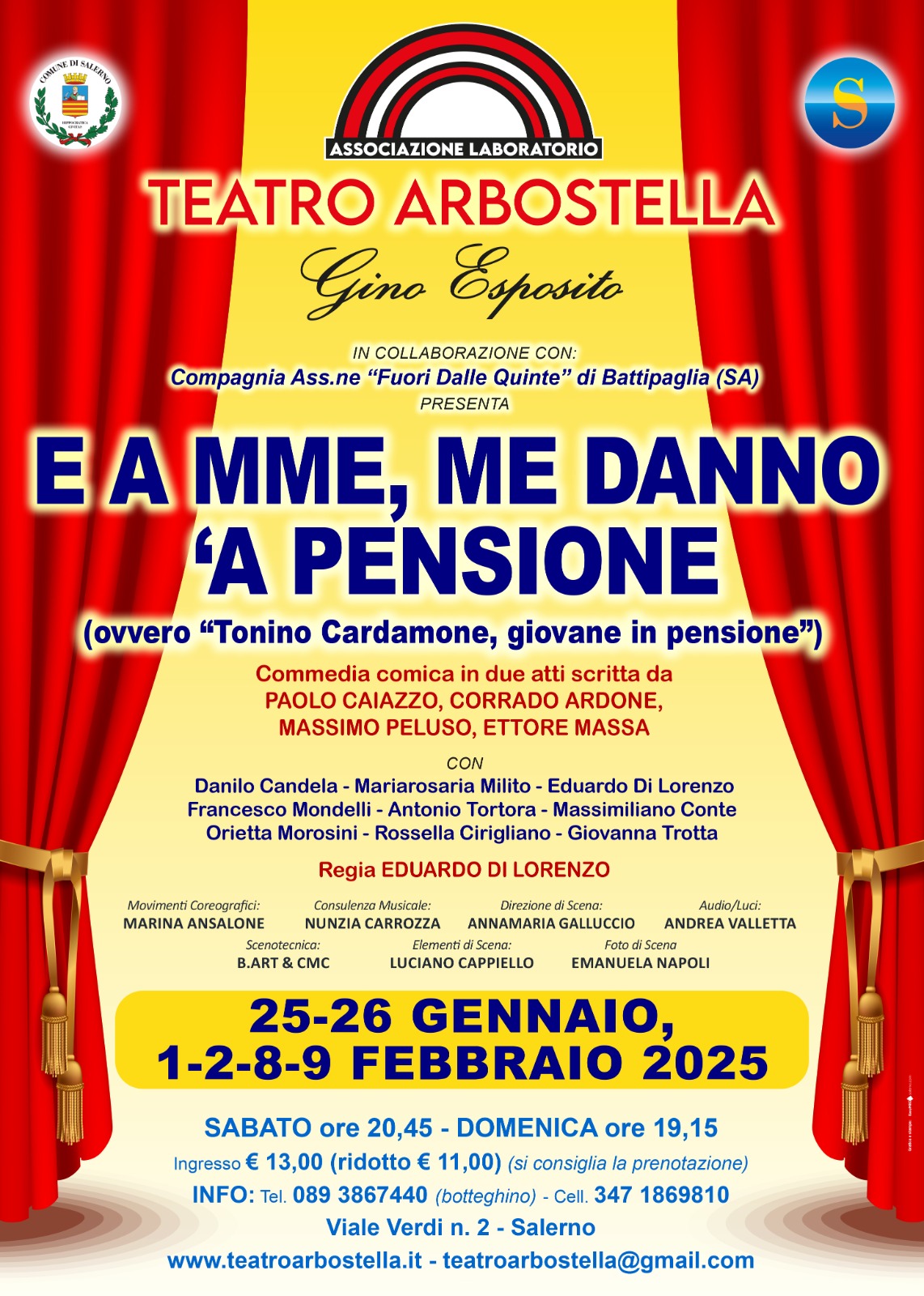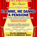 Per l’ultimo week-end di gennaio e per i primi due di febbraio, momenti di pura comicità e sagaci battute cabarettistiche con la Compagnia Fuori dalle Quinte in “E a mme, me danno a’ pensione – ovvero Tonino Cardamone giovane in pensione”, una farsa che attinge dalla vita reale. La comicità irriverente dell’autore, Paolo Caiazzo (in collaborazione con Ardone, Peluso e Massa) è l’elemento principale di questa commedia, rappresentata magistralmente dalla compagnia teatrale battipagliese che conta nel suo organico ottimi e giovani interpreti che coinvolgeranno il pubblico in un vortice d’ilarità. La regia è di Eduardo Di Lorenzo.