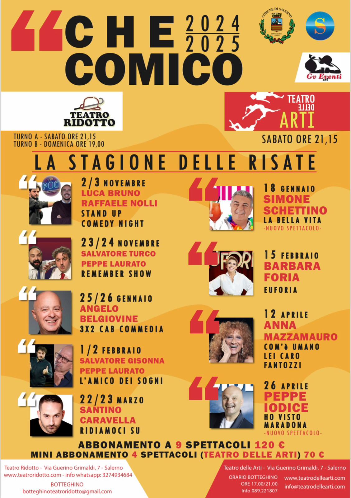 Da novembre ad aprile torna Che Comico, la stagione 2024 – 2025 ideata dalla Gv Eventi di Gianluca e Valentina Tortora, con l’idea di regalare una risata antistress, sempre mista alla riflessione di cui ognuno nel fine settimana ha storicamente bisogno. Cinque gli spettacoli al Teatro Ridotto, quattro al Teatro delle Arti, entrambi in Via Grimaldi a Salerno.