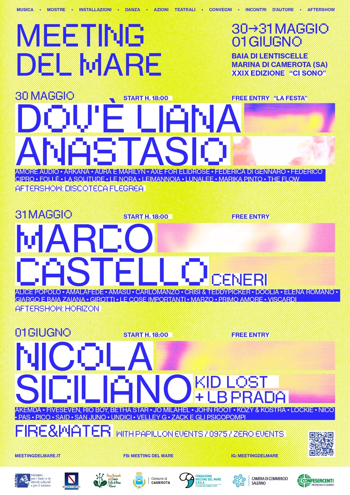 Nato nel 1997 da un’idea di don Gianni Citro e dalla determinazione di giovani cilentani appassionati di musica e arte, il Meeting del Mare è l’evento musicale/culturale gratuito più longevo del sud Italia. Nel corso degli anni ha ospitato grandi nomi del panorama musicale italiano e in alcuni casi anche internazionale. Tra i tanti: Franco Battiato, Vinicio Capossela, Francesco De Gregori, Enzo Avitabile, Geolier, Caparezza, NuGenea, Tananai, J-Ax, Baustelle, Mannarino, Subsonica, Piero Pelù, Gogol Bordello, Negrita, Morgan, Dubioza Kolektiv, Bombino, Carmen Consoli, Afterhours, Elisa, Max Gazzè, Daniele Silvestri, Bandabardò, Fabrizio Moro, Lo Stato Sociale, Verdena, Articolo31, Le Vibrazioni, Ministri, Marta Sui Tubi, Linea77, Elio e le Storie Tese, Frankie HI-NRG, Marracash, Motel Connection, Il Teatro Degli Orrori, Sud Sound System, 24 Grana, Otto Ohm, Maldestro, Modena City Ramblers, Kutso, I Cani, Foja, Cosmo, Calcutta, Gianluca Grignani, Eugenio Bennato, solo per citarne alcuni.