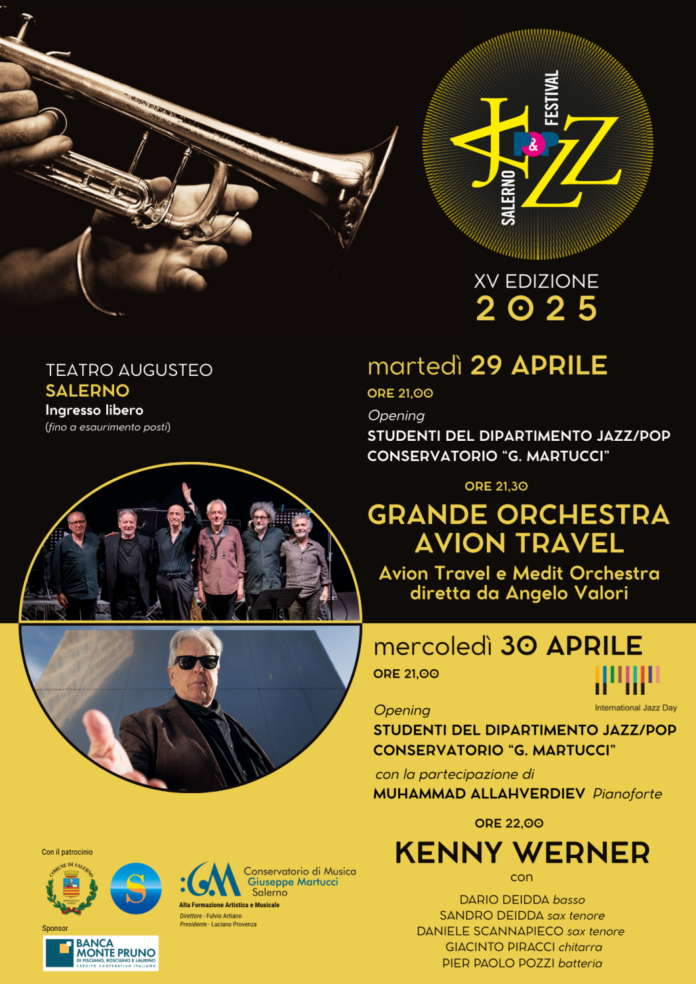 Tra i protagonisti dell’edizione 2025, insieme agli studenti del Dipartimento Jazz/Pop del Conservatorio coordinati dal prof. Vincenzo Danise, la Grande Orchestra Avion Travel, in collaborazione con la Medit Orchestra diretta da Angelo Valori, e il celebre pianista jazz statunitense Kenny Werner, figura di riferimento della scena jazz internazionale.