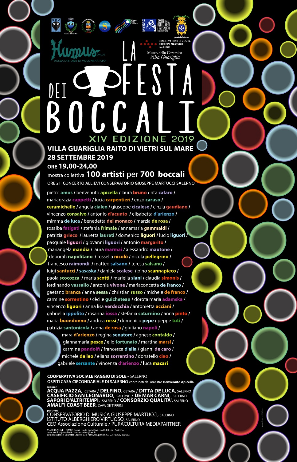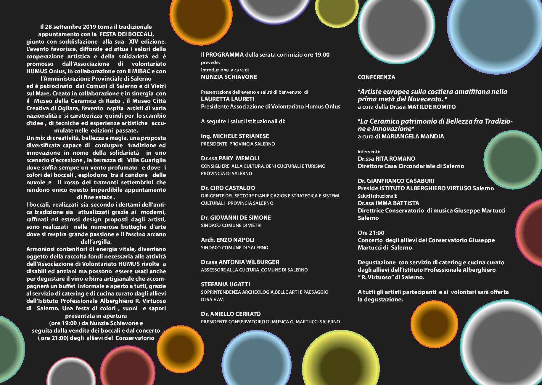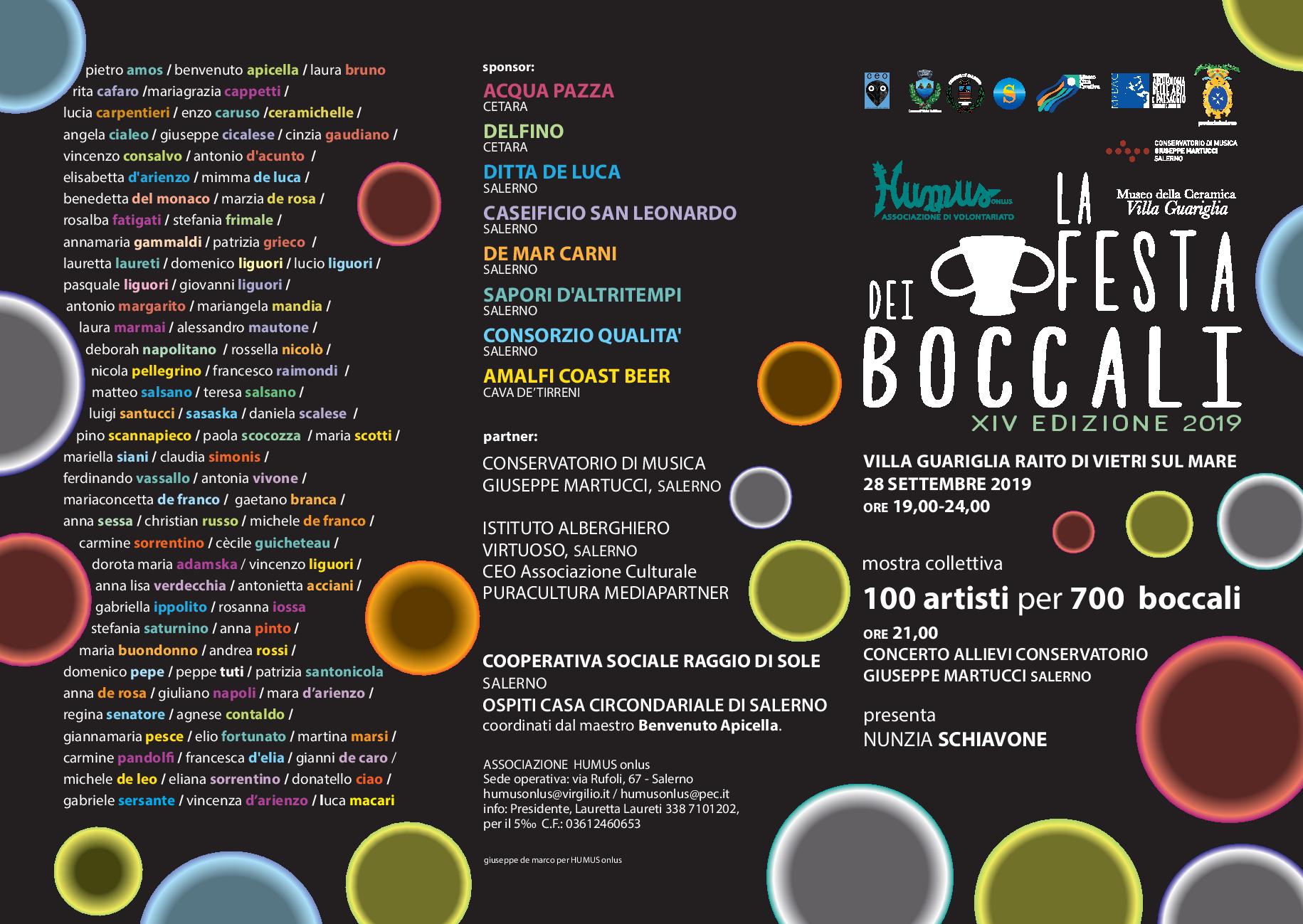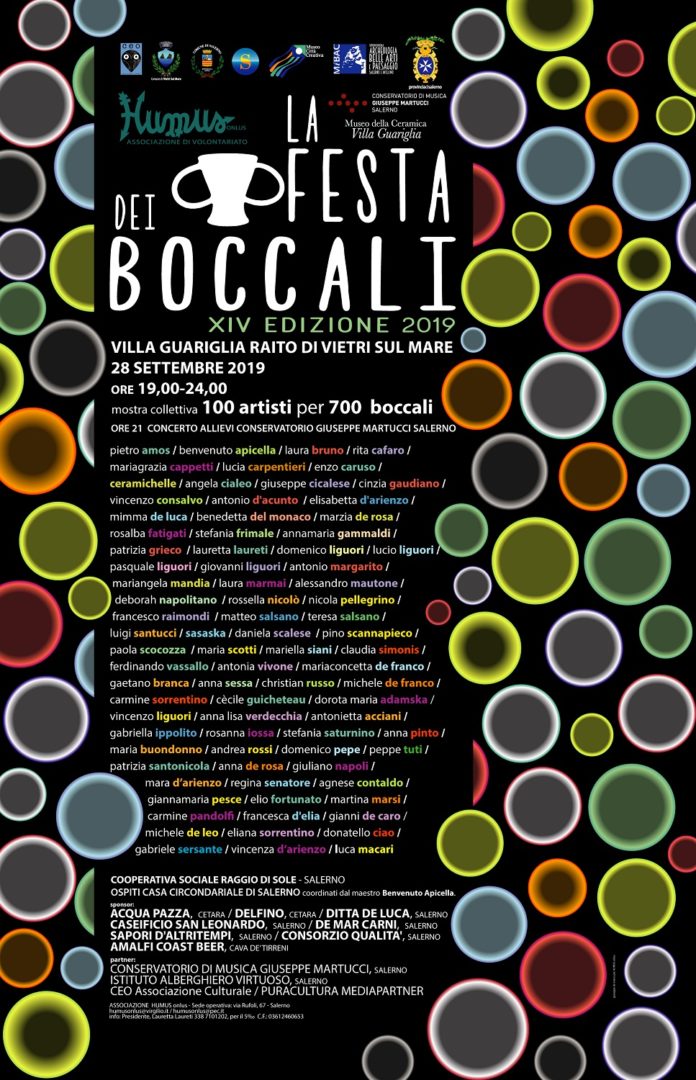 Il 28 settembre 2019 torna il tradizionale appuntamento con la FESTA DEI BOCCALI,giunto con soddisfazione alla sua XIV edizione. L’evento favorisce, di‑onde ed attua i valori della cooperazione artistica e della solidarietà ed è promosso dall’Associazione di volontariato HUMUS Onlus, in collaborazione con il MIBAC e con l’Amministrazione Provinciale di Salerno ed è patrocinato dai Comuni di Salerno e di Vietri sul Mare.