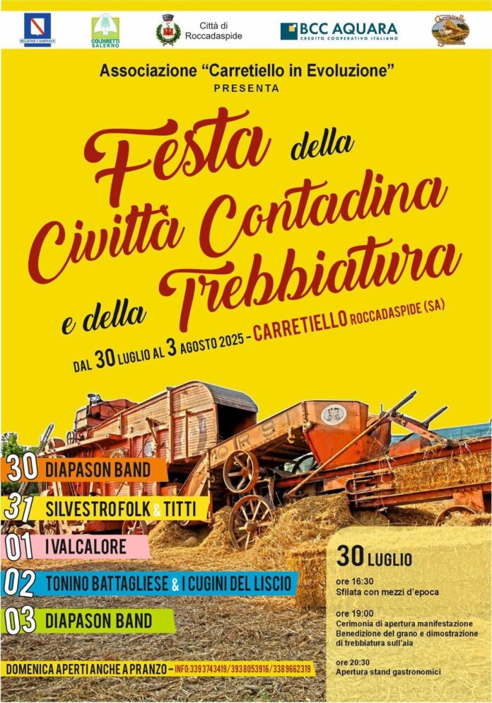 L’appuntamento è quindi a Carretiello, dal 30 luglio al 3 agosto. La “Festa della Civiltà Contadina e della Trebbiatura” non è soltanto un evento folkloristico, ma una vera e propria esperienza culturale e sensoriale: un invito a riscoprire l’identità profonda di un territorio che, attraverso la memoria della fatica nei campi e la gioia dello stare insieme, continua a seminare futuro.