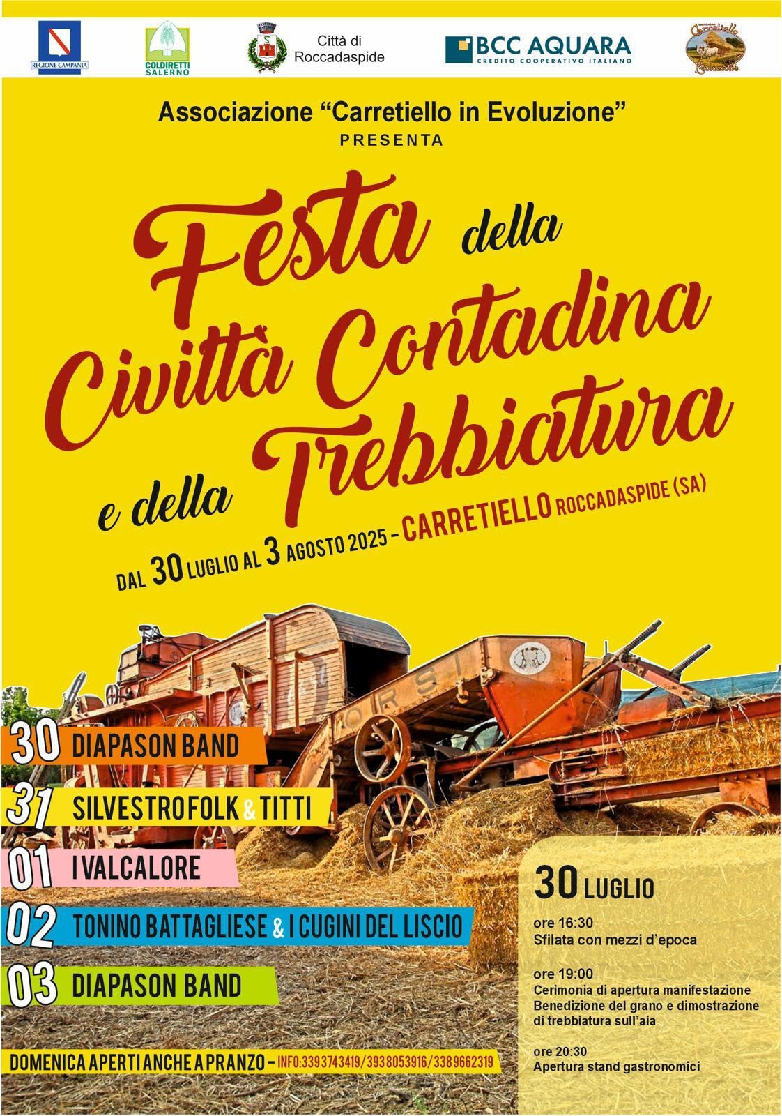 Dal 30 luglio al 3 agosto 2025, la contrada Carretiello sarà il palcoscenico naturale della “Festa della Civiltà Contadina e della Trebbiatura”, uno degli appuntamenti più attesi dell’estate cilentana. Promossa e organizzata con passione dall’associazione no profit Carretiello in Evoluzione, la manifestazione rappresenta un vero e proprio omaggio alla cultura contadina e alla memoria agricola del territorio, attraverso un ricco percorso tra sapori antichi, riti rurali e musica popolare.