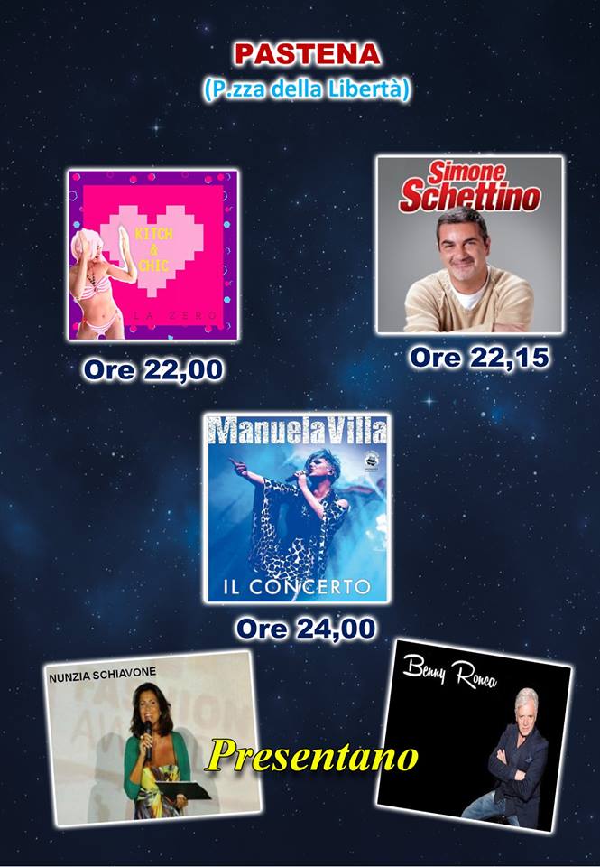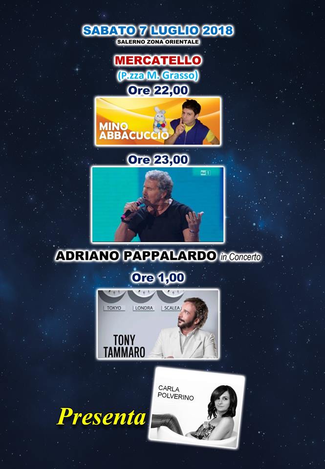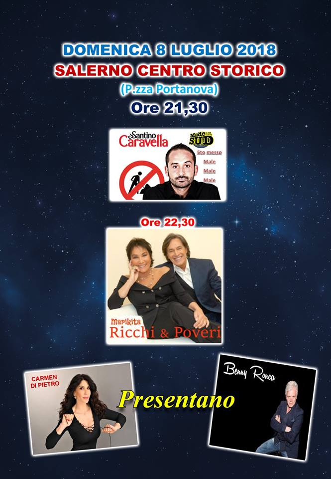 Si comincia venerdì 6 luglio alle ore 19 con il concerto del Maestro Vince Tempera ospitato nel Santuario della Madonna del Carmine. Sabato 7 luglio, a Pastena (ore 18), in Piazza Caduti Civili di Brescia, ex Largo Prato, in scena La Compagnia degli Sbuffi con lo spettacolo teatrale di burattini. Alle ore 20.30, Ascarimé Cicerenella. Alle ore 20.45, sempre a Pastena, nella Parrocchia Cuore Immacolato di Maria (Chiesa Madonna di Fatima), recital di Antonello Rondi e Francesco Malapena alle ore 20.45. Sabato 7 luglio, nella zona orientale, la scena si sposterà a Piazza Monsignor Grasso: alle ore 22, risate assicurate con Mino Abbacuccio. Alle ore 23, ecco l’intramontabile Adriano Pappalardo in concerto. Chiusura all’una di notte con Tony Tammaro. Sabato giorno clou sempre a Pastena, alle ore 22, con Simone Schettino. Alle ore 23 il concerto di Manuela Villa. A Torrione, invece, in Piazza Gloriosi, alle ore 22 si esibirà Hales e alle ore 22.30 toccherà a Thema. Alle ore 23 ecco Virginio e alle ore 24 Almamegretta & Raiz. Domenica 8 luglio, chiusura a Piazza Portanova: alle ore 21.30, cabaret di Santino Caravella… che sta messo “male, male, male”. Alle ore 22.30, Ricchi & Poveri in concerto.