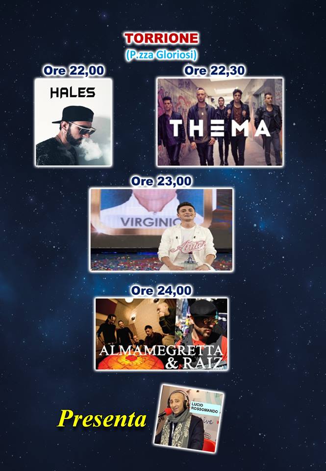 Tanti artisti in concerto a Mercatello, Pastena, Torrione, Piazza Portanova: Almamegretta & Raiz, Adriano Pappalardo, Hales, Thema, Ricchi&Poveri, Manuela Villa. Risate assicurate con Simone Schettino