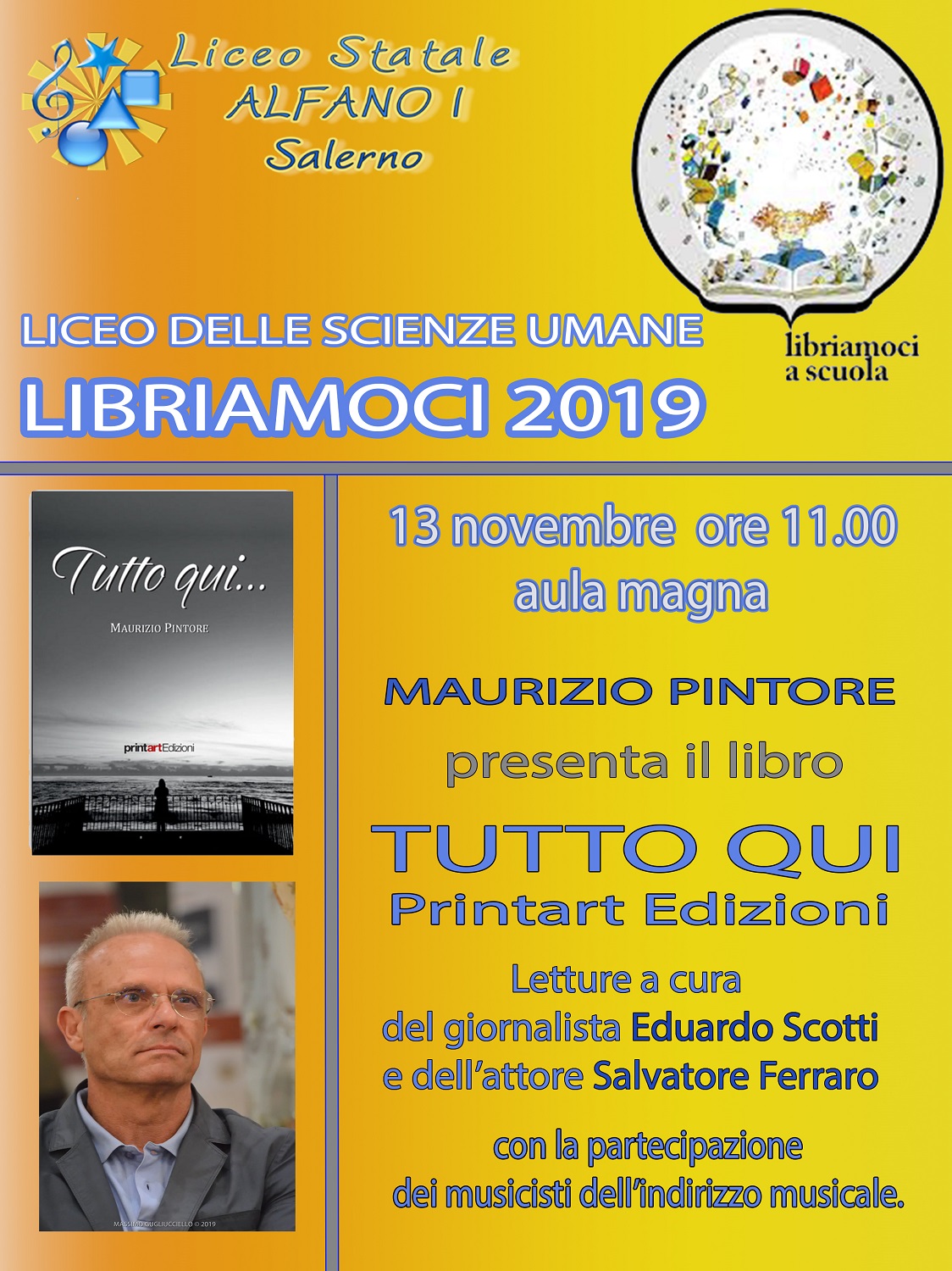 Libriamoci è una lodevole e piacevole iniziativa , promossa dal MIUR del MIBACT e dal Centro per Lettura, che il Liceo Statale “Alfano I” di Salerno vive da cinque anni invitando scrittori, poeti, giovani e meno giovani autori locali e nazionali, con lettura interpretativa , accompagnata dalle sonorità dei musicisti dell’indirizzo musicale e dalle voci di giornalisti, attori, docenti e studenti. Giornate di lettura nelle scuole, che anche quest’anno si rivolge alle scuole di tutta Italia, dalle elementari alle superiori, invitandole a includere nelle attività scolastiche delle giornate momenti di lettura ad alta voce.