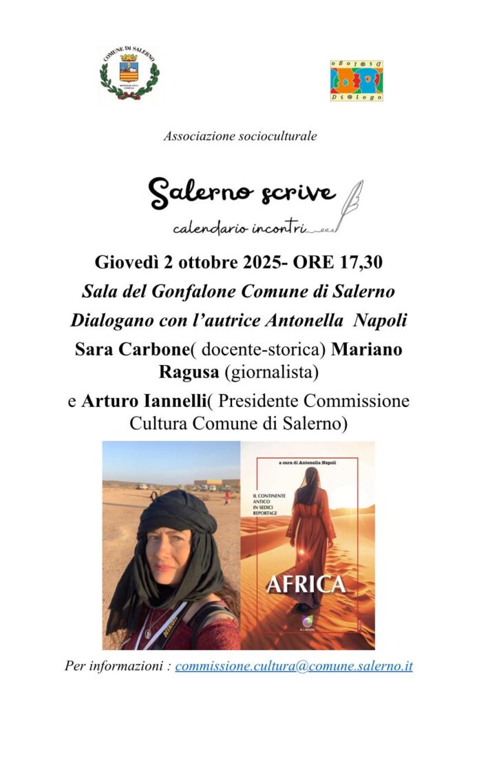 Riprende dopo la pausa estiva la Rassegna” Salerno scrive”, organizzata dal dalla Commissione Cultura del Comune di Salerno, presieduta dal dott. Arturo Iannelli, il 2 ottobre, alle ore 17,30 presso il Salone del Gonfalone del Comune di Salerno, in collaborazione con l’Associazione socioculturale “Di@logo”.