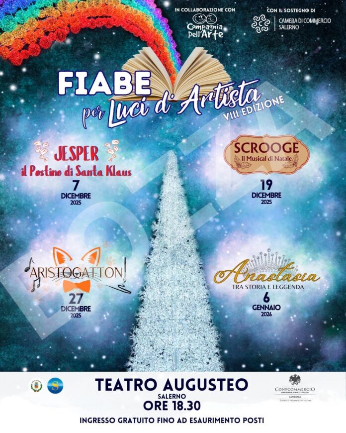 In particolare, per questa VIII edizione, all’Augusteo, il 7 dicembre andrà in scena Jesper, il Postino di Santa Klaus, il 19 dicembre Scrooge, il Musical di Natale, il 27 dicembre Aristogattoni e Anastasia, tra storia e leggenda il 6 gennaio. Mentre, al Centro Sociale di Pastena, Il Principe Schiaccianoci e la Magia del Natale il 20 dicembre e Il Grinch il 5 gennaio. I biglietti verranno distribuiti nei negozi aderenti da regalare ai clienti più affezionati per assicurarsi un posto in platea. Per tutto il periodo delle festività, da dicembre a gennaio, saranno tanti i momenti da scartare sotto l’albero dedicati all’intrattenimento di grandi e piccini, pensati anche a sostegno delle attività commerciali e ristorative. Spazio ai buoni sentimenti con tutto il bello della favolistica antica e moderna, insieme alla Compagnia dell’Arte per la regia di Antonello Ronga che annuncia una rassegna che andrà dritta al cuore, proponendo ben sei family show, già grandi classici della tradizione. Ad aprire il sipario il 7 dicembre sarà l’avventura di Jesper, il Postino di Santa Klaus mandato in un paesino sperduto della Lapponia, dove, insieme al misterioso Klaus, riuscirà a riportare amore, gentilezza e spirito natalizio in un luogo dominato dal rancore. Il 19 dicembre arriva Scrooge, il Musical di Natale portando in scena l’intramontabile storia di redenzione del celebre uomo d’affari che, grazie alla visita di tre spiriti, riscopre la bontà e il valore del Natale. Subito dopo, il 20 dicembre, Il Principe Schiaccianoci e la Magia di Natale per un viaggio incantato nella casa di Clara dove la Vigilia di Natale tutto prende vita: lo schiaccianoci diventa eroe e l’amore di una bambina trasforma il mondo in un luogo di magia e speranza. Il 27 dicembre, insieme agli Aristogattoni tra Parigi e le sue atmosfere eleganti, i gatti di Madame Bonfamille affrontano mille avventure per ritrovare la strada di casa, scoprendo la forza della famiglia e la magia del Blues. Un nuovo anno e altre fiabe da scoprire, con Il Grinch il 5 gennaio, una storia divertente e colorata in cui il burbero Grinch tenterà di sabotare la festa più amata, finendo però per scoprire il vero spirito del Natale grazie alla forza dell’amicizia e della condivisione. In chiusura, il 6 gennaio giorno dell’Epifania, c’è Anastasia, tra storia e leggenda per una fiaba romantica e avventurosa tra Russia e Francia: Anya, giovane orfana senza passato, parte alla ricerca della verità sulla propria identità affrontando incantesimi, misteri e il potere del destino.