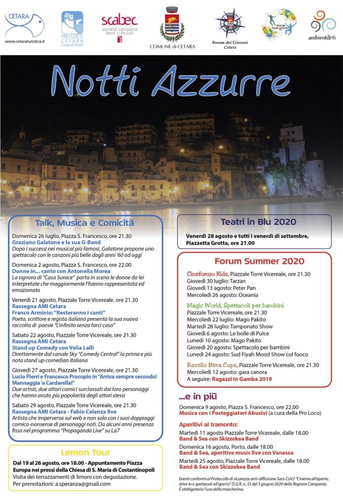 A Cetara l’estate si tinge di azzurro. Reduci dalla chiusura forzata per l’emergenza sanitaria, l’amministrazione comunale è lieta di accogliere ancora una volta le “Notti Azzurre”, il cartellone di eventi costruiti interamente sul territorio, con la promozione delle sue eccellenze: un contenitore di idee che, soprattutto durante l’esperienza degli ultimi anni, vanta di aver raccolto consensi, attraverso iniziative che valorizzassero i beni, le attività produttive eco-sostenibili e la tradizione eno-gastronomica, nonché l’immenso valore paesaggistico del suggestivo borgo incastonato nella Costiera Amalfitana.