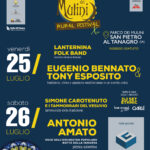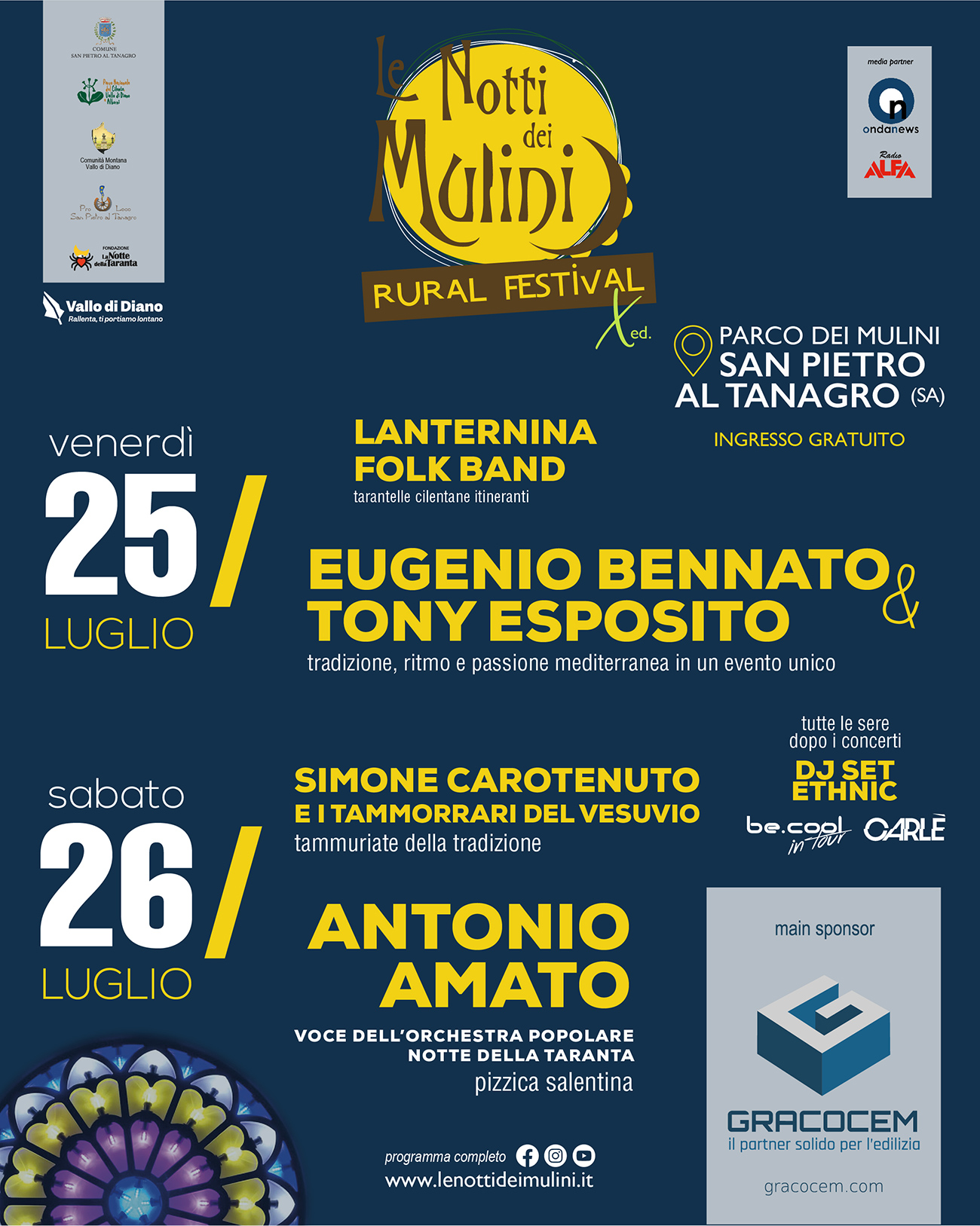 Venerdì 25 luglio, la serata inaugurale vedrà protagonisti due giganti della musica popolare italiana: Eugenio Bennato e Tony Esposito. Un evento eccezionale che, a distanza di 30 anni, per la prima volta in Campania riunisce sullo stesso palco due artisti che hanno segnato la storia della musica del Sud. Un concerto che si preannuncia unico e irripetibile, un concentrato di tradizione, ritmo e passione mediterranea. Ad aprire la serata saranno gli organetti e le ciaramelle itineranti di Lanternina Folk Band con un repertorio di tarantelle locali.