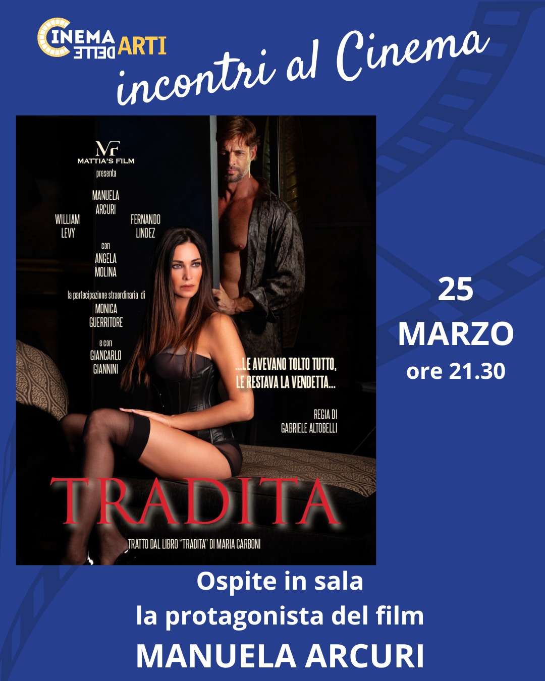 Salerno si prepara ad accogliere una delle icone più amate del cinema e della TV italiana. Mercoledì 25 marzo, alle ore 21:30, il Cinema Teatro Delle Arti ospiterà una serata evento esclusiva: la proiezione del film “Tradita”, che vedrà la partecipazione straordinaria della protagonista Manuela Arcuri.