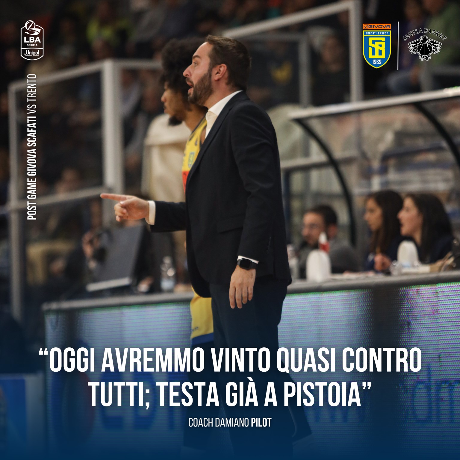 Il coach della Givova, Damiano Pilot: «La partita è stata sicuramente divertente per qualsiasi spettatore; abbiamo dovuto fare degli aggiustamenti in settimana e concesso ovviamente a Trento delle cose piuttosto che delle altre. Per lo stato di forma in cui l’Aquila si è presentata qui, si è capito sin da subito che qualsiasi nostra scelta sarebbe stata punita: tirare qui col 50% da tre punti (32 tentativi) orienta e non poco la partita. Mi prendo la soddisfazione di aver visto la reazione veemente dei ragazzi dopo la trasferta di Reggio Emilia dove praticamente non ci eravamo presentati, probabilmente la prestazione di stasera sarebbe bastata per ottenere i 2 punti contro la stragrande maggioranza delle squadre della lega, non basta contro questa ingiocabile Trento. Ripartiamo da tutti gli spunti positivi di questa serata perché sabato prossimo contro Pistoia non possiamo permetterci di sbagliare».