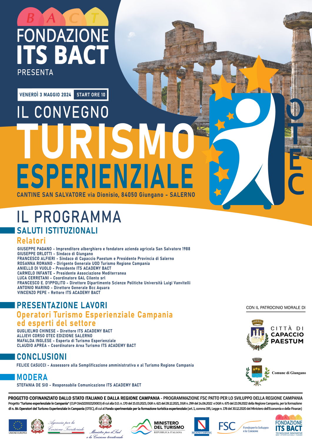 Venerdì 3 Maggio 2024, a partire dalle ore 10, alle Cantine San Salvatore di Giungano, in provincia di Salerno, si terrà il secondo Convegno della Fondazione ITS BACT per presentare, alla stampa e al territorio, i prodotti turistici realizzati dagli operatori di settore che hanno preso parte alla edizione salernitana del corso sul Turismo Esperienziale. Oltre ai formatori dell’ITS BACT, che ha erogato il corso, saranno presenti esperti nazionali e internazionali del comparto turistico per discutere della realtà e del futuro del Turismo Esperienziale in Campania e in tutto il Mezzogiorno. Saranno presenti, oltre ai partner di progetto e agli 84 operatori che hanno frequentato il corso, l’Assessore regionale al Turismo, Felice Casucci, il Dirigente Generale UOD Turismo della Regione Campania, Rosanna Romano, il Sindaco di Giungano Giuseppe Orlotti e il Sindaco di Capaccio Paestum e Presidente della Provincia di Salerno Francesco Alfieri. L’evento vede il patrocinio morale di Città di Capaccio Paestum e del Comune di Giungano.