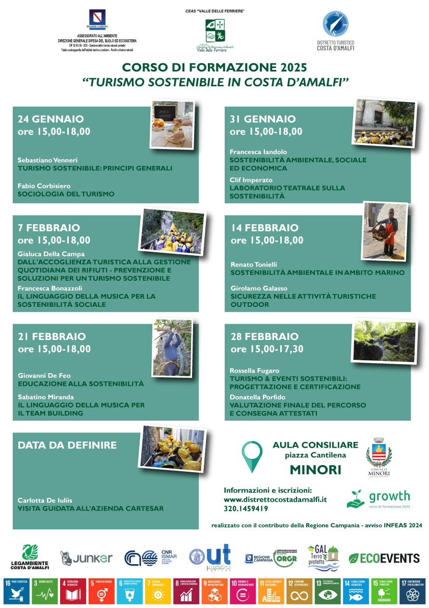 Il corso rientra anche nel più ampio programma di formazione delle masterclass Growth del Distretto Turistico Costa d’Amalfi, da oltre dieci anni impegnato a promuovere formazione di qualità per la crescita del territorio, che così sostiene attraverso la propria rete anche questo progetto di educazione alla sostenibilità che pone al centro gli obiettivi dell’Agenda 2030.
