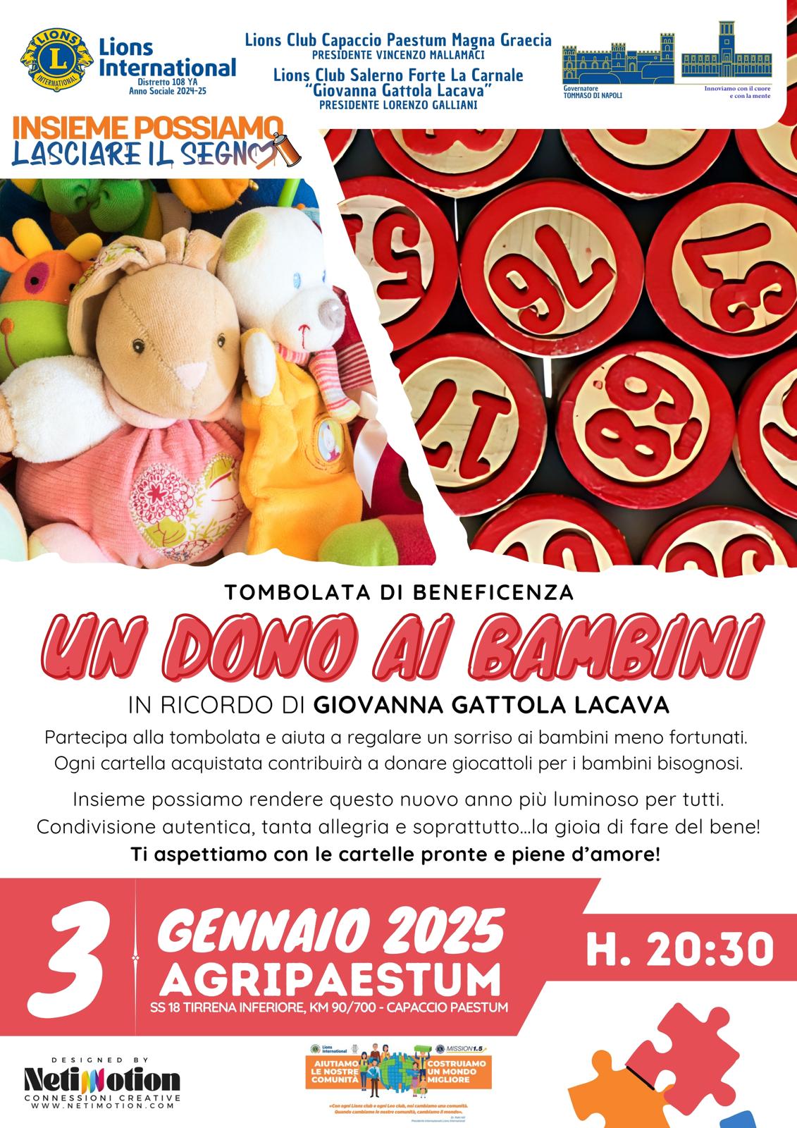 Il Lions Club Capaccio Paestum Magna Grecia, presieduto dal Dott. Vincenzo Mallamaci, e il Lions Club Salerno Forte La Carnale “Giovanna Gattola Lacava”, guidato dal Presidente Lorenzo Galliani, organizzano una tombolata benefica dal titolo “Un dono ai bambini”, in ricordo della compianta Giovanna Gattola Lacava.