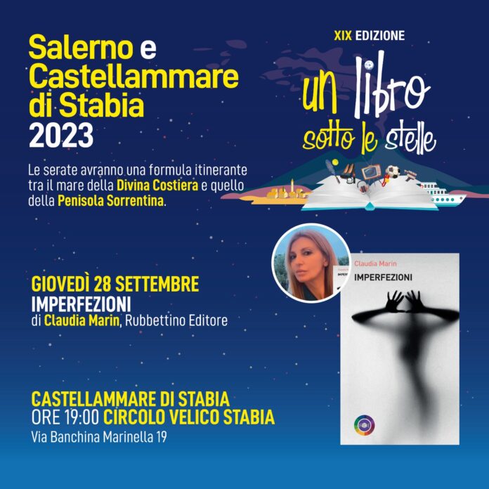 Ormeggiato il traghetto Acquarius della Travelmar, che ha accompagnato il primo appuntamento dei sette incontri di #unlibrosottolestelle, nelle acque della Divina Costiera, si riparte giovedì 28 settembre dalla terrazza panoramica del Circolo Velico Stabia di Castellammare di Stabia, con il romanzo Imperfezioni di Claudia Marin, Rubbettino Editore a cui prenderanno parte Lino Di Capua, delegato alla cultura del Circolo Velico Stabia ed i giornalisti Franco Buononato e Nello De Martino. Ad accogliere gli ospiti con un cocktail di benvenuto saranno Giuseppe Esposito, Presidente del Circolo Velico Stabia, Alfonso Giarletta, Event Manger dell’Associazione Meridiani, Stefano Lombardi, Presidente Rotary e-Club Due Golfi e Vincenzo Ungaro, già Presidente del Consiglio Comunale di Castellammare di Stabia e collaboratore della manifestazione. Ad emozionare gli ospiti sarà l’esibizione musicale degli studenti del Liceo Scientifico “Francesco Severi” – indirizzo musicale di Castellammare di Stabia, preceduta dai saluti della dirigente scolastica Elena Cavaliere.