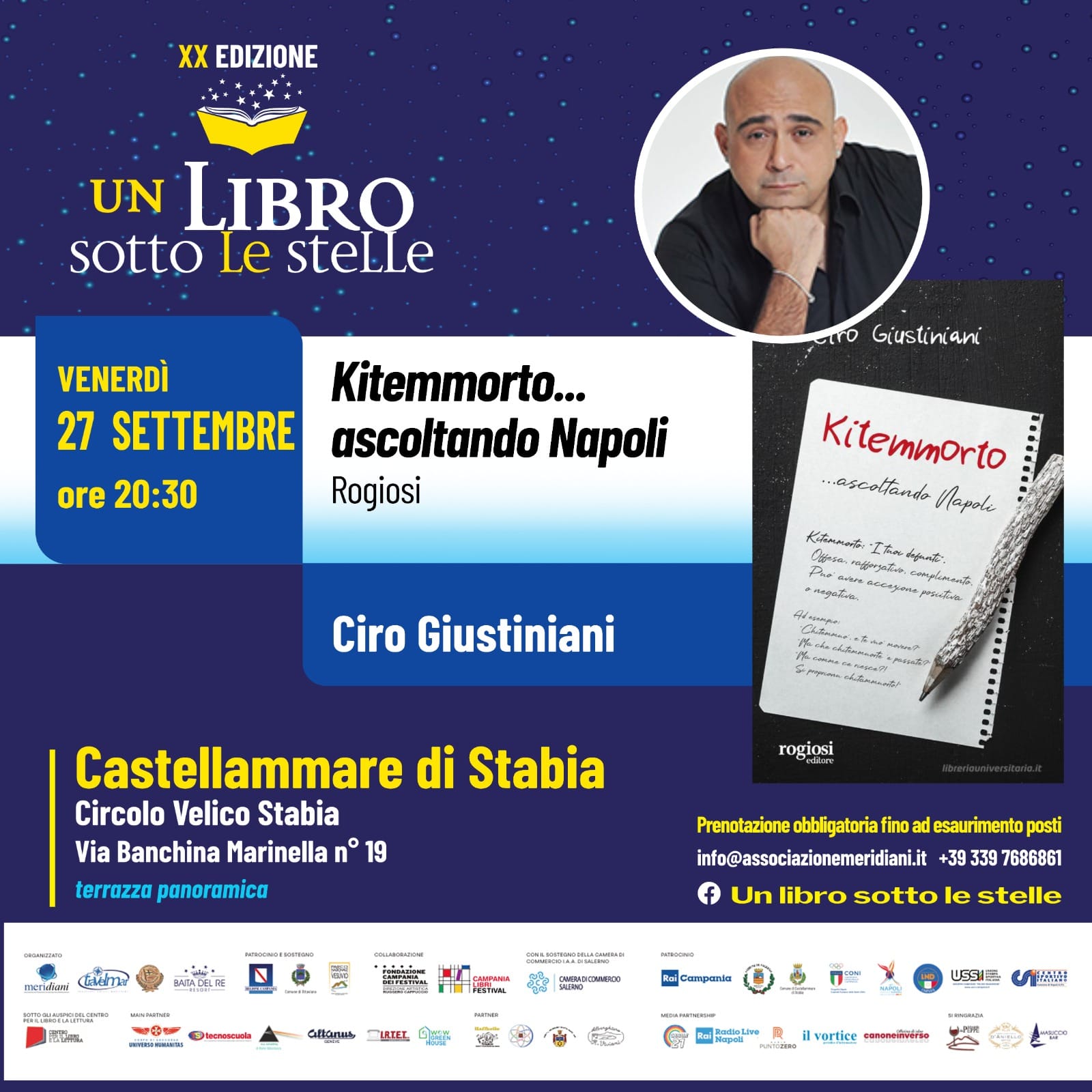 Lasciate le pendici del Vesuvio, la rassegna conclude il terzo ed ultimo ciclo degli incontri sulla terrazza panoramica del Circolo Velico Stabia di Castellammare di Stabia. Si inizia venerdì 27 settembre con la presentazione del libro Kitemmorto…ascoltando Napoli di Ciro Giustiniani, attore comico e scrittore noto per le sue partecipazioni in trasmissioni televisive di successo come Made in Sud, Mad in Italy e La Domenica più Tradizionale, che ripercorre un viaggio nella lingua napoletana e nelle sue espressioni più significative. Sabato 30 settembre sarà la volta di Angelo Mascolo con il romanzo La stagione dell’ultimo sguardo. Il commissario Vito Annone e il vetturino. La chiusura del terzo ciclo degli incontri è affidata allo scrittore torinese Guido Catalano con Cosa fanno le femmine in bagno?