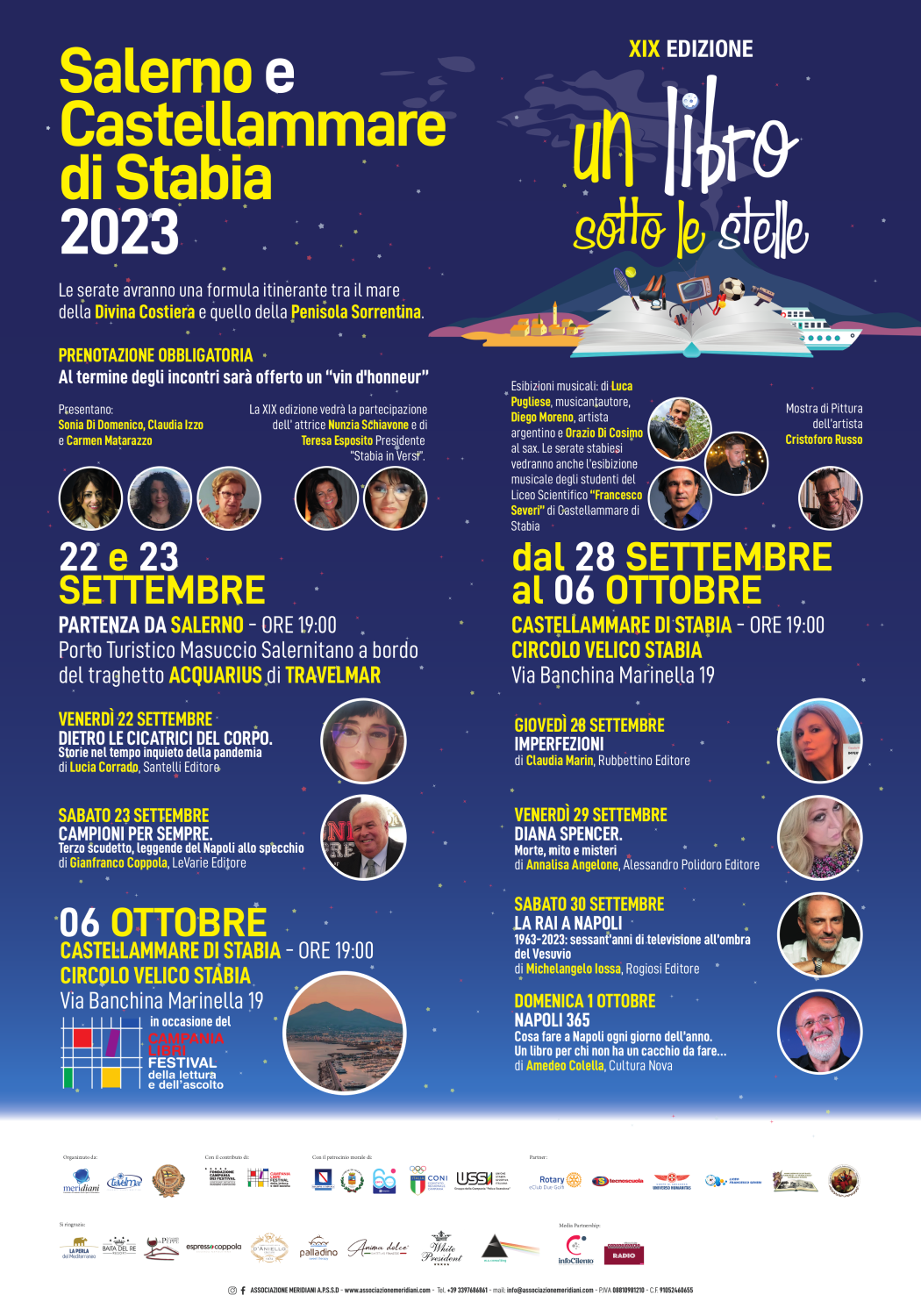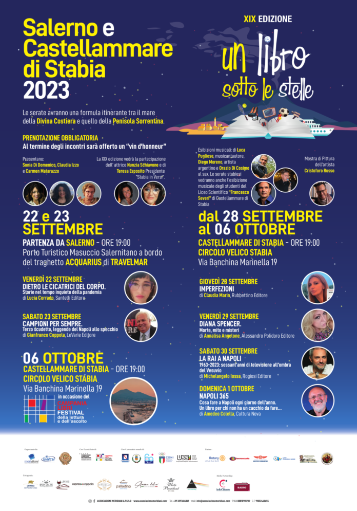Ritorna in Campania “Un libro sotto le stelle”, rassegna ideata e promossa dall’Associazione Meridiani in collaborazione con la Tra.Vel.Mar., la Fondazione Campania dei Festival e il Circolo Velico Stabia, con il patrocinio di RAI Campania, della Regione Campania, del Comune di Salerno, del Coni Campania, dell’Unione Stampa Sportiva Italiana, del Rotary e-Club Due Golfi, del Centro Formativo Tecnoscuola e di Universo Humanitas e con la media partnership di Radio Canone Inverso e InfoCilento.