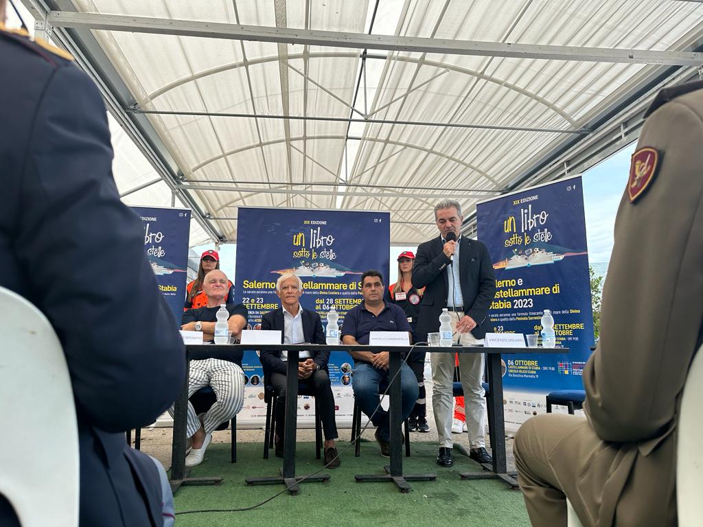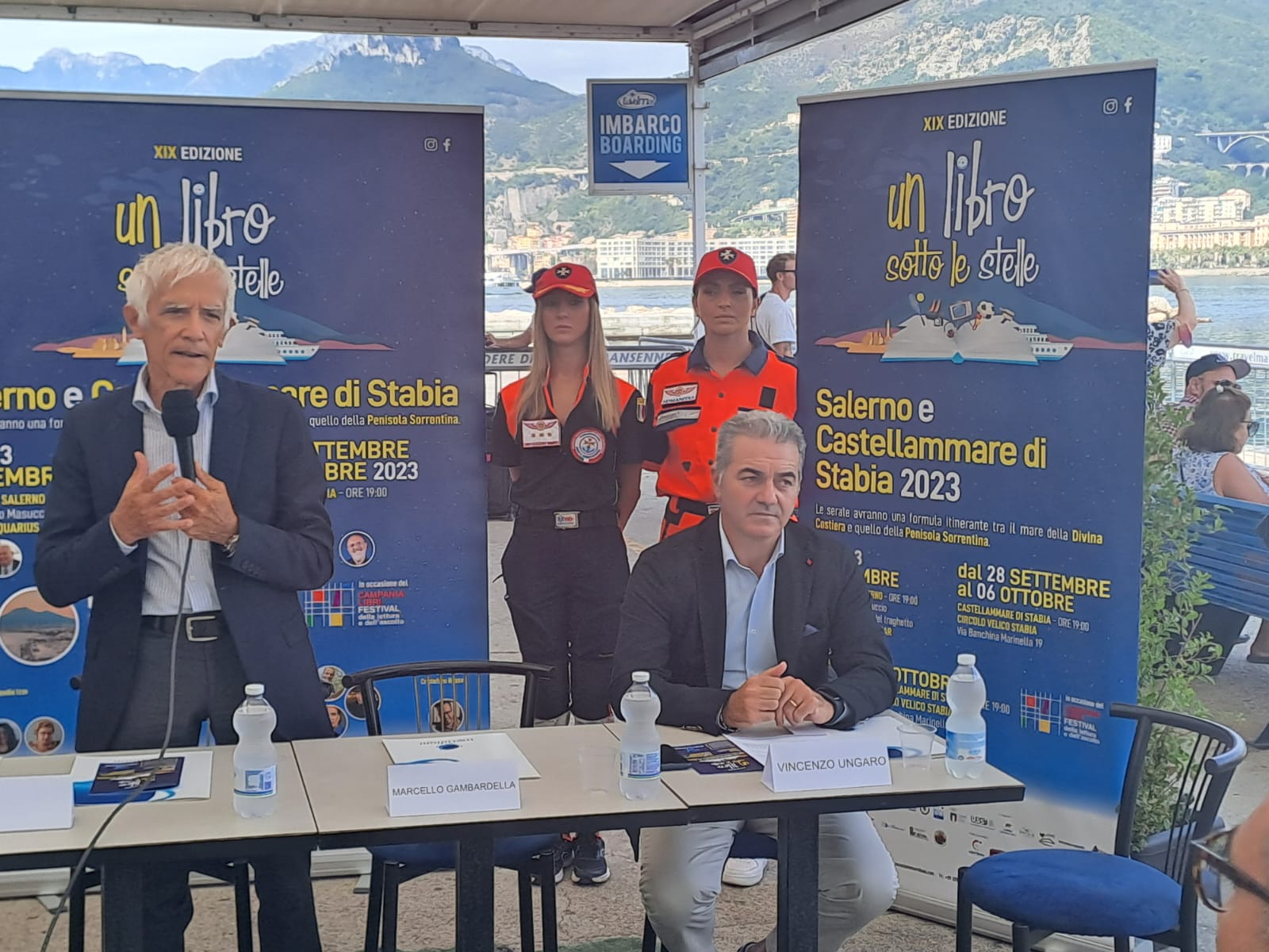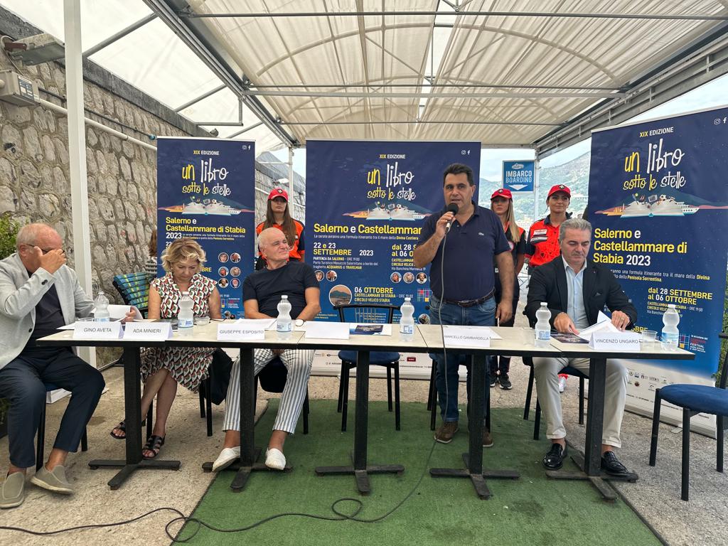 Il cartellone della XIX edizione della rassegna letteraria “Un libro sotto le stelle”, in programma dal 22 settembre, è stato presentato questa mattina presso il Porto Turistico Masuccio Salernitano alla presenza di Ermanno Guerra, Consigliere Comunale del Comune di Salerno, Franco Picarone, Presidente della Commissione Bilancio della Regione Campania, Ada Minieri, Vicepresidente dell’Associazione Meridiani, Giuseppe Esposito, Presidente Circolo Velico Stabia, Vincenzo Ungaro, già Presidente del Consiglio Comunale di Castellammare di Stabia, Stefano Lombardi, Presidente del Rotary e-Club Due Golfi, Roberto Schiavone di Favignana, Presidente dell’Universo Humanitas, Edmondo Gallo Direttore di Tecnoscuola e Marcello Gambardella della Tra.Vel.Mar. Ha coordinato i lavori Gino Aveta, autore televisivo e radiofonico.