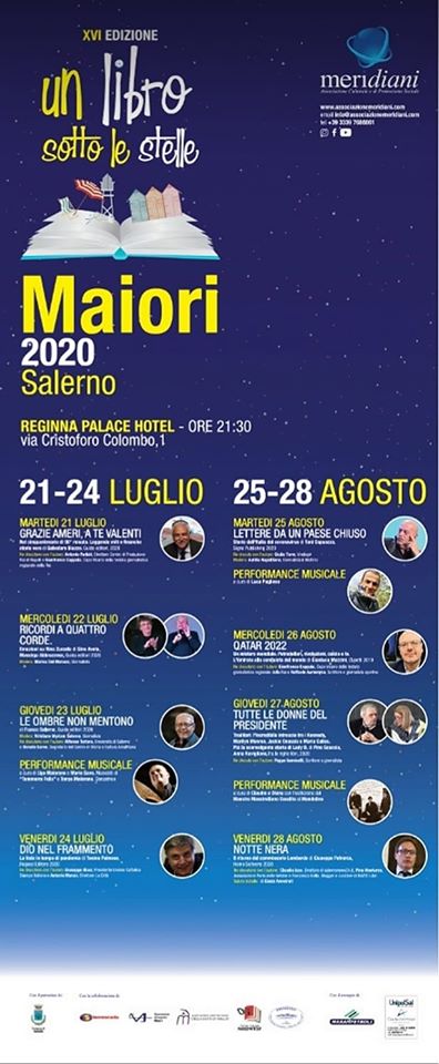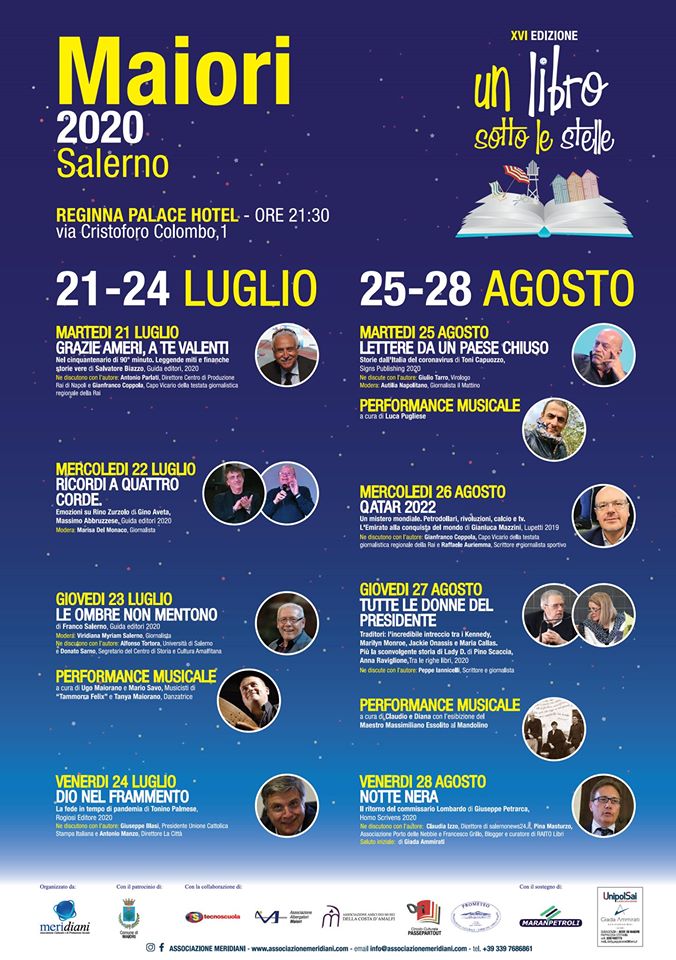La Rassegna Nazionale Editoriale “Un libro sotto le stelle” ritorna nella città di Maiori grazie all’impegno dell’Associazione Amici dei Musei della Costa d’Amalfi, l’Associazione Albergatori di Maiori e il Centro Professionale Tecnoscuola. La manifestazione si terrà presso il Reginna Palace Hotel dal 21 al 24 luglio e dal 25 al 28 agosto. La rassegna si avvale della collaborazione dell’Associazione Prometeo e del Circolo culturale Passepartout.