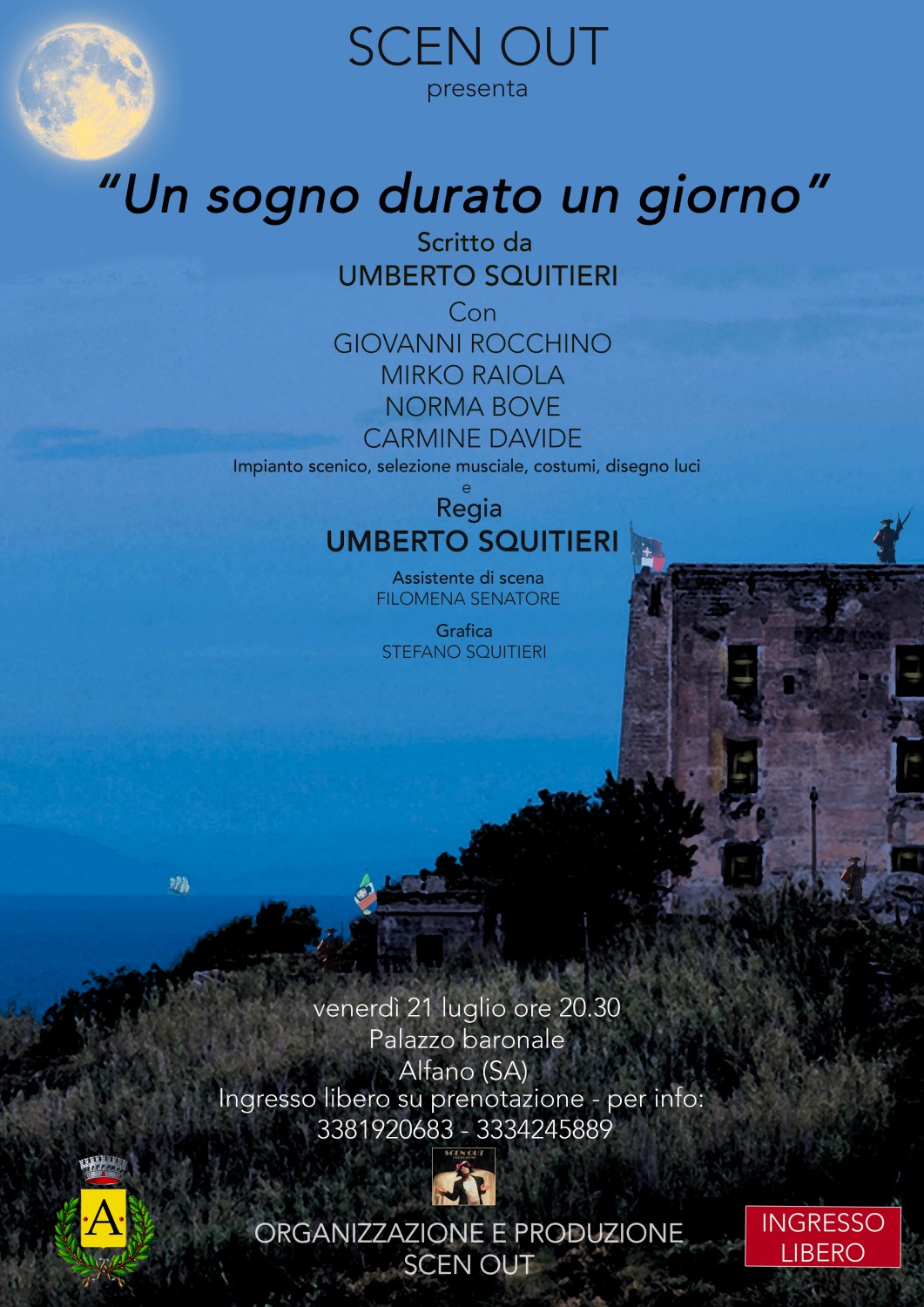 Con il patrocinio del Comune di Alfano, il progetto teatrale scritto e diretto da Umberto Squitieri, farà tappa presso il palazzo baronale Speranza, il prossimo 21 luglio alle ore 20:30.