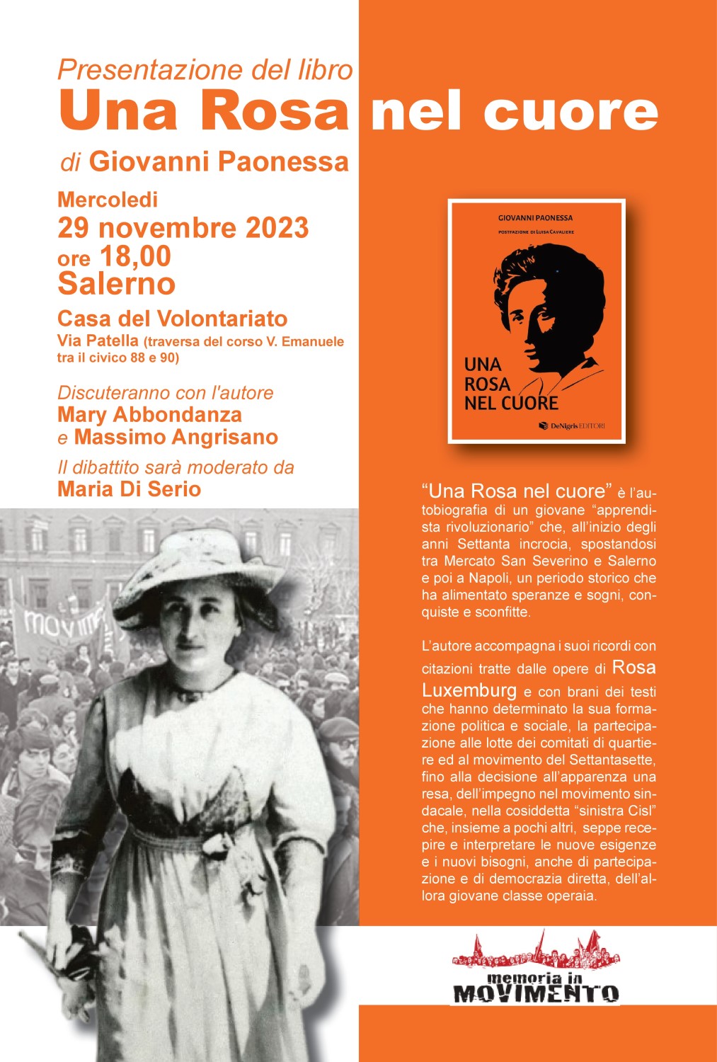 Mercoledì 29 novembre 2023, alle ore 18,00, presso la Casa del Volontariato in via Patella (traversa del c/so V. Emanuele tra il civico 88 e 90) a Salerno, l’Associazione “Memoria in Movimento” – che di recente ha celebrato i primi dieci anni di attività – ha organizzato la presentazione del libro “Una Rosa nel cuore” di Giovanni Paonessa.