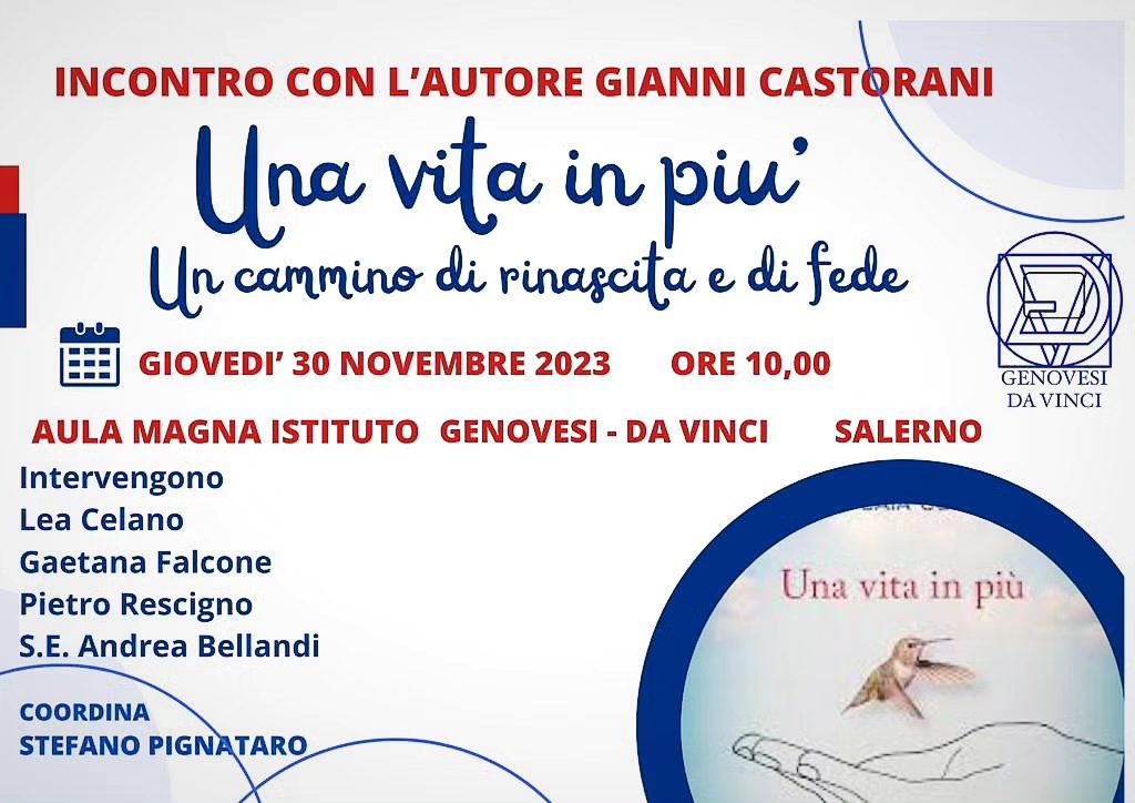 Si svolgerà giovedì 30 novembre, alle ore 10:00, presso l’Aula Magna dell’ISS “Genovesi-Da Vinci” di Salerno, la presentazione del volume di Don Gianni Castorani “Una vita in più. Un cammino di rinascita e di fede” (Piemme Edizioni).