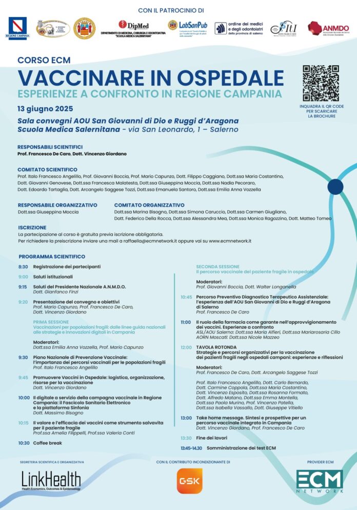 In un contesto regionale che promuove ed incentiva la buona pratica delle vaccinazioni, il 13 giugno 2025, si terrà presso l’Aula Scozia dell’AOU San Giovanni di Dio e Ruggi d’Aragona di Salerno, il Convegno dal titolo: “Vaccinare in Ospedale”, esperienze a confronto in Regione Campania, con i Responsabili Scientifici Prof. Francesco De Caro, Responsabile Vaccinazioni AOU Ruggi, Professore Associato di Igiene e Medicina Preventiva Dipartimento di Medicina, Chirurgia e Odontoiatria “Scuola Medica Salernitana”, Università degli Studi di Salerno, e Vincenzo Giordano, Direttore UOD 02- Direzione Generale per la Tutela della Salute e il Coordinamento del SSR, Giunta Regionale della Campania.