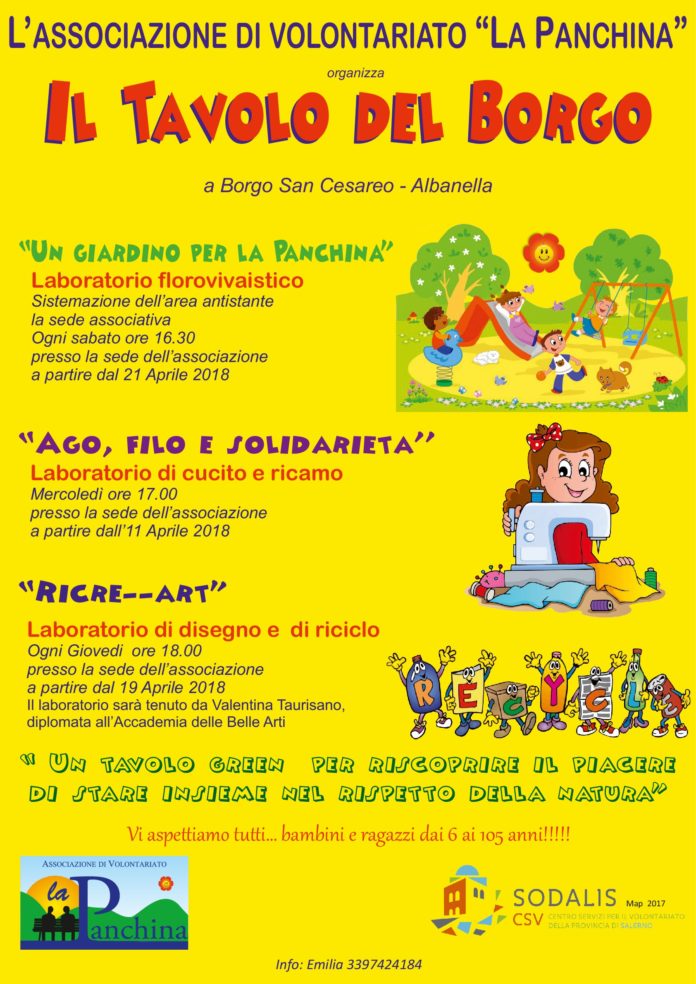 Ha preso il via mercoledì 11 aprile 2018, a Borgo San Cesareo – Albanella, “Il Tavolo del Borgo”. “Il Tavolo del Borgo” è la nuova iniziativa promossa dall’associazione di volontariato La Panchina di Albanella. Il primo appuntamento si è svolto mercoledì 11 aprile 2018, alle ore 17, presso la sede dell’Associazione La Panchina, a Borgo San Cesareo, con “Ago, Filo e Solidarietà”, alla direzione di questo laboratorio c’è la signora Anita, che, con l’ausilio di tante volontarie, appassionate di cucito e ricamo, ogni settimana daranno vita a nuove creazioni artigianali.