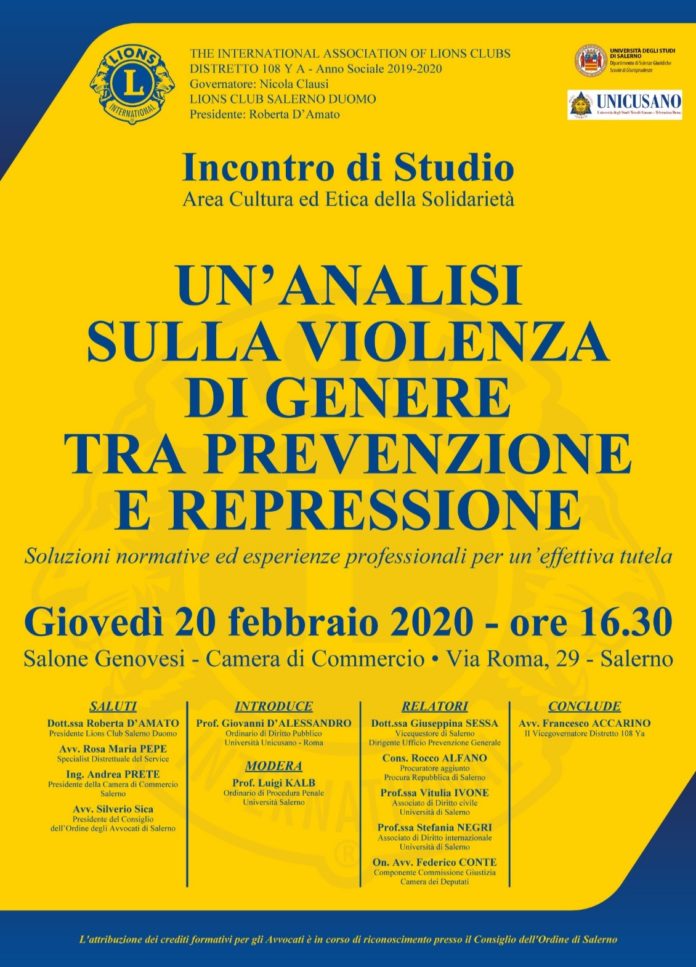 Giovedì 20 febbraio al Salone Genovesi della Camera di Commercio di Salerno si terrà l’incontro organizzato dal Lions Club Salerno Duomo sull’annosa tematica della violenza di genere intitolato “Un’analisi sulla violenza di genere tra prevenzione e repressione. Soluzioni normative ed esperienze professionali per un’effettiva tutela”.