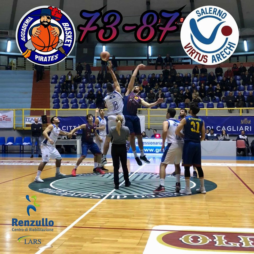 La Renzullo LARS Virtus Arechi Salerno respinge l’assalto dei Pirati ed espugna il PalaPirastu di Cagliari. I ragazzi del presidente Nello Renzullo si impongono per 73-87 nella gara valida per la 13^ giornata del campionato di Serie B Old Wild West e tengono il passo delle prime della classe. Barcellona supera nettamente Isernia e resta in vetta, Palestrina soffre solo un tempo con la Tiber Basket Roma e poi dilaga. Il roster allestito dal diesse Pino Corvo col successo conseguito in casa della Fotodinamico sale a quota 20 punti e resta al terzo posto assieme alla Virtus Valmontone, che si è aggiudicata la sfida con la LUISS Sport Roma. A due giornate dal termine del girone d’andata, i giochi per la qualificazione alle Final Eight di Coppa Italia sono ancora apertissimi, soprattutto in considerazione del fatto che prima del giro di boa ci sono diversi scontri diretti che potrebbero mutare gli equilibri. Il quintetto di coach Paternoster, intanto, ha dato continuità al successo ottenuto la scorsa settimana contro Valmontone, pur non potendo impiegare Babilodze (in panchina ad onor di firma, in quanto influenzato).