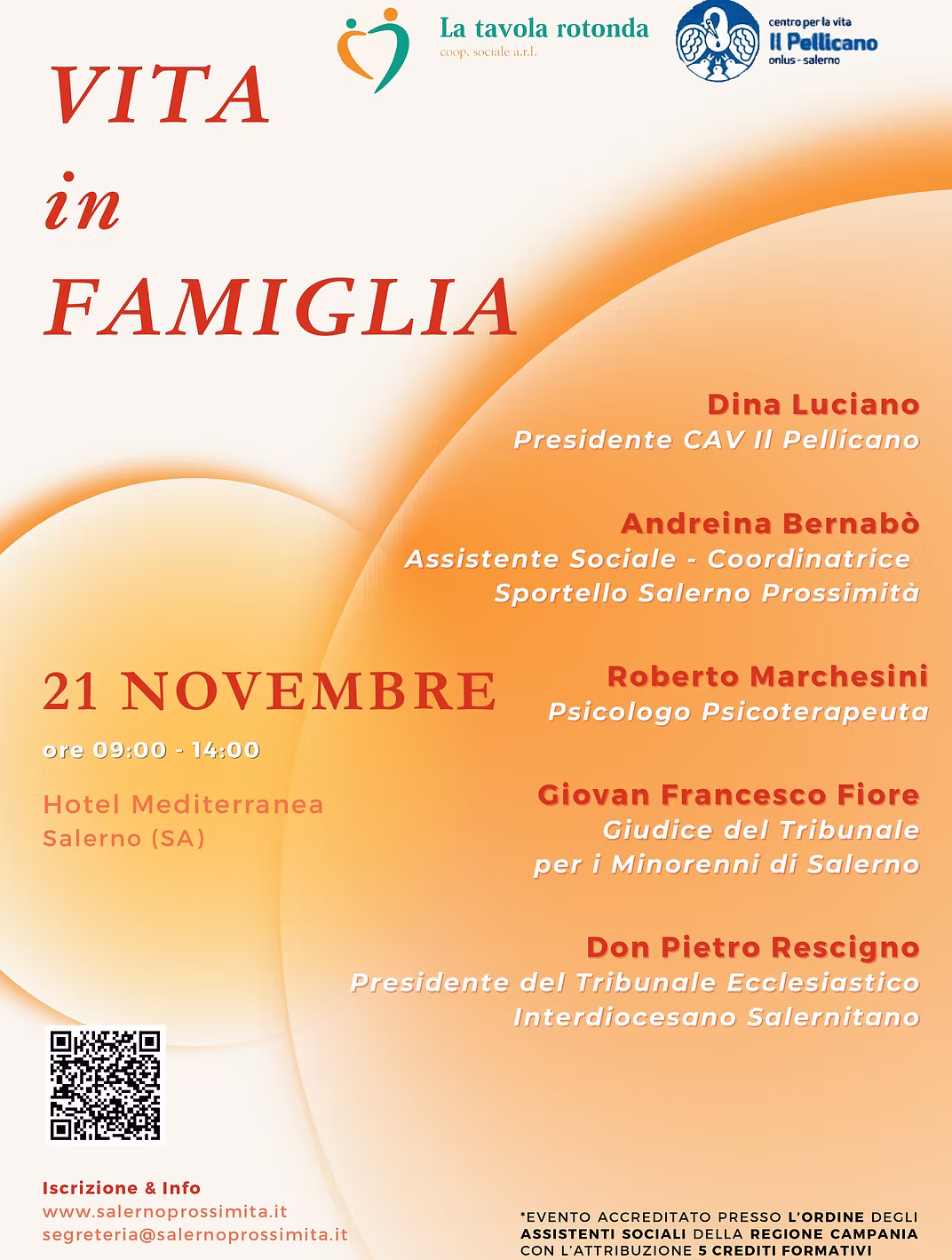 Organizzato dal Centro per la VITA “Il Pellicano” e dalla Coop. Sociale “La Tavola Rotonda”, l’evento è accreditato presso l’Ordine degli Assistenti Sociali della Regione Campania e riconosce 5 crediti formativi.