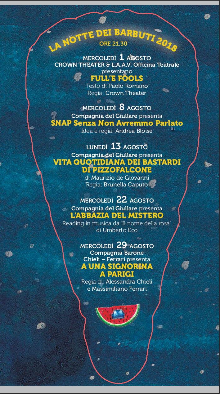 Torna anche quest’anno la Notte dei Barbuti, una mini rassegna parallela di 5 spettacoli che si svolgerà sempre in largo Santa Maria dei Barbuti alle 21.30 in serate alternative al cartellone tradizionale. La Notte dei Barbuti, a cura di Brunella Caputo, anticiperà quest’anno l’apertura del sipario della rassegna il 1 agosto, per proseguire poi nei giorni 8-13-22-29 agosto.