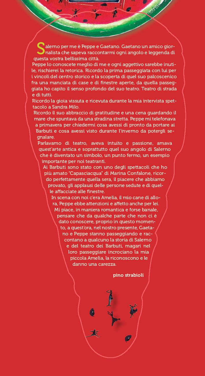 Il noto autore, regista teatrale e conduttore televisivo Pino Strabioli ha scritto il testo introduttivo della XXXIII rassegna dei Barbuti. Il testo, riportato nella brochure, è un commovente ricordo di Natella e degli anni di proficua collaborazione: “Peppe mi telefonava a primavera per chiedermi cosa avessi di pronto da portare ai Barbuti e cosa avessi visto durante l’inverno da potergli segnalare. Parlavamo di teatro, aveva intuito e passione, amava quest’arte antica e soprattutto quel suo angolo di Salerno che è diventato un simbolo, un punto fermo, un esempio importante per noi teatranti.