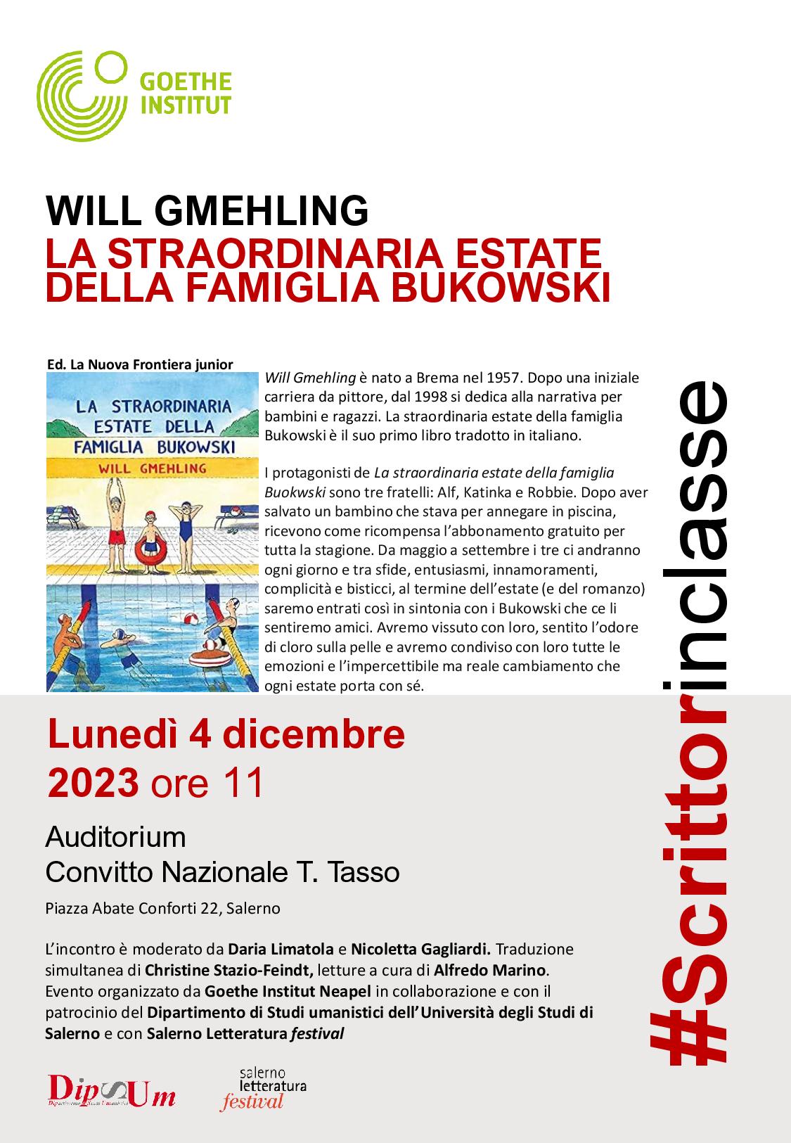 Primo appuntamento di dicembre con i #Fuorifestival di Salerno Letteratura. Lunedì 4 dicembre alle 11, nell’Auditorium del Convitto Nazionale “Torquato Tasso” di Salerno, in piazza Abate Conforti 22, si terrà un incontro con lo scrittore Will Gmehling, autore di “La straordinaria estate della famiglia Bukowski” (edizioni La Nuova Frontiera junior). Ad aprire la giornata i saluti istituzionali del Rettore Claudio Naddeo e della direttrice del Goethe-Institut Neapel Maria Carmen Morese. L’incontro è moderato da Daria Limatola e Nicoletta Gagliardi. Traduzione consecutiva di Christine Stazio-Feindt, letture a cura di Alfredo Marino. Evento organizzato dal Goethe-Institut Neapel in collaborazione e con il patrocinio del Dipartimento di Studi umanistici dell’Università degli Studi di Salerno e con Salerno Letteratura festival.